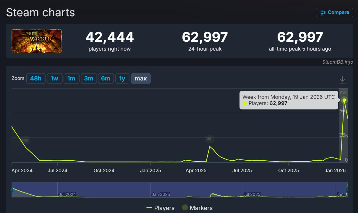 【《恶意不息》合作模式更新后,Steam玩家峰值创历史新高】《恶意不息》合作模式“Together”更新已于上周推出。根据SteamDB的数据显示,此次更新上线后游戏人气得到了极大的提升。目前本作在Steam上的玩家峰值数已超过6.2万(62997),不仅创下新纪录,且比首发时的3.6万要高出许多。《恶意不息》现已在Steam上推出抢先体验版,游戏累计销量已破百万,其正式版预计也将登陆主机平台。