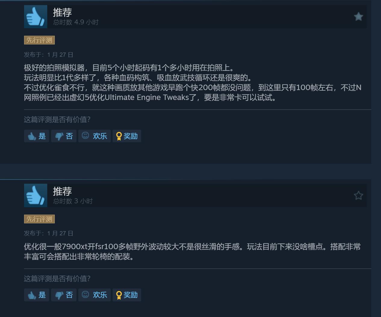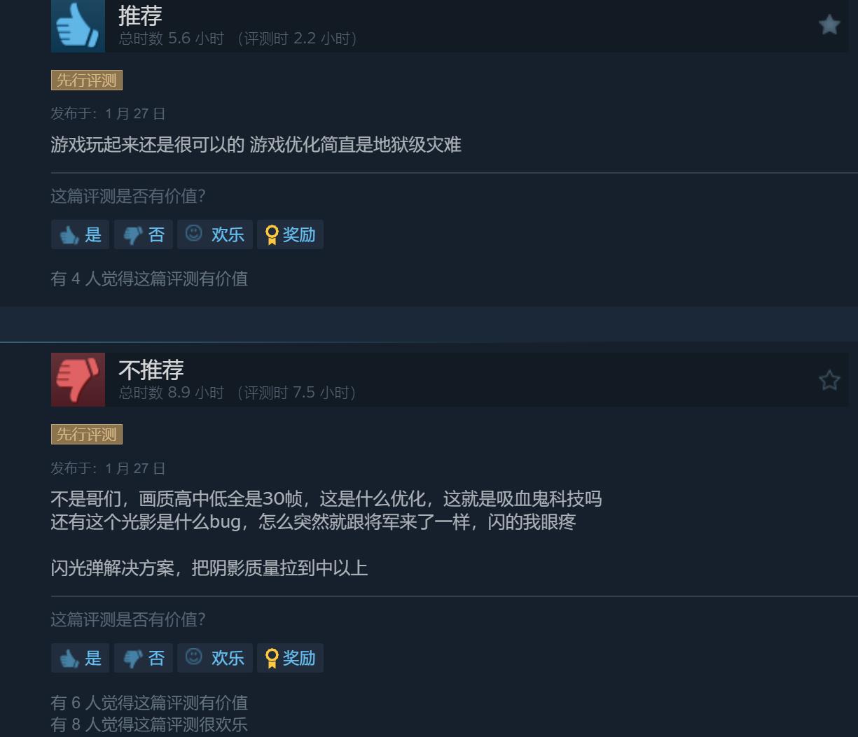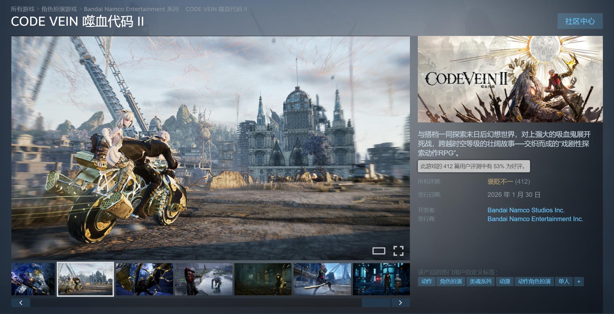 【《噬血代码2》Steam上评价“褒贬不一”,玩家吐槽优化太差】由万代南梦宫所打造的ARPG《噬血代码2》即将于1月29日正式发售,购买了豪华/终极版的玩家现已可提前进入游戏。截至目前,本作在Steam上已有412篇玩家评测,其中好评率为53%,整体评价“褒贬不一”。玩家们的差评主要集中在游戏的优化上,不少人表示有遇到严重掉帧、光影异常等问题。除开优化之外,游戏方面不少玩家觉得战斗手感相对前作有些许进步,地图设计上也比之前成熟了不少,至少没有白血教堂这样的地图了,配装方面也比较丰富。总的来看像是前作的升级版。《噬血代码2》Steam国区标准/豪华/终极版的售价分别为268/398/468元,游戏支持中文。