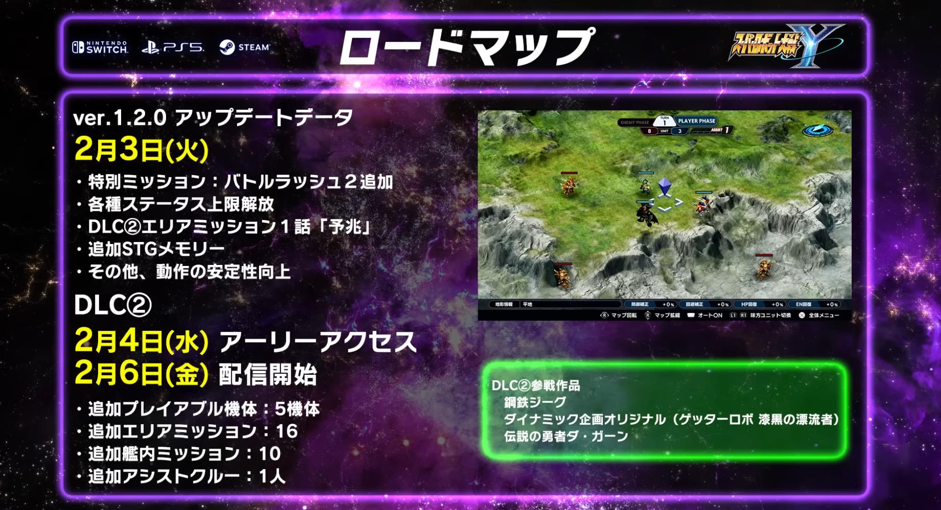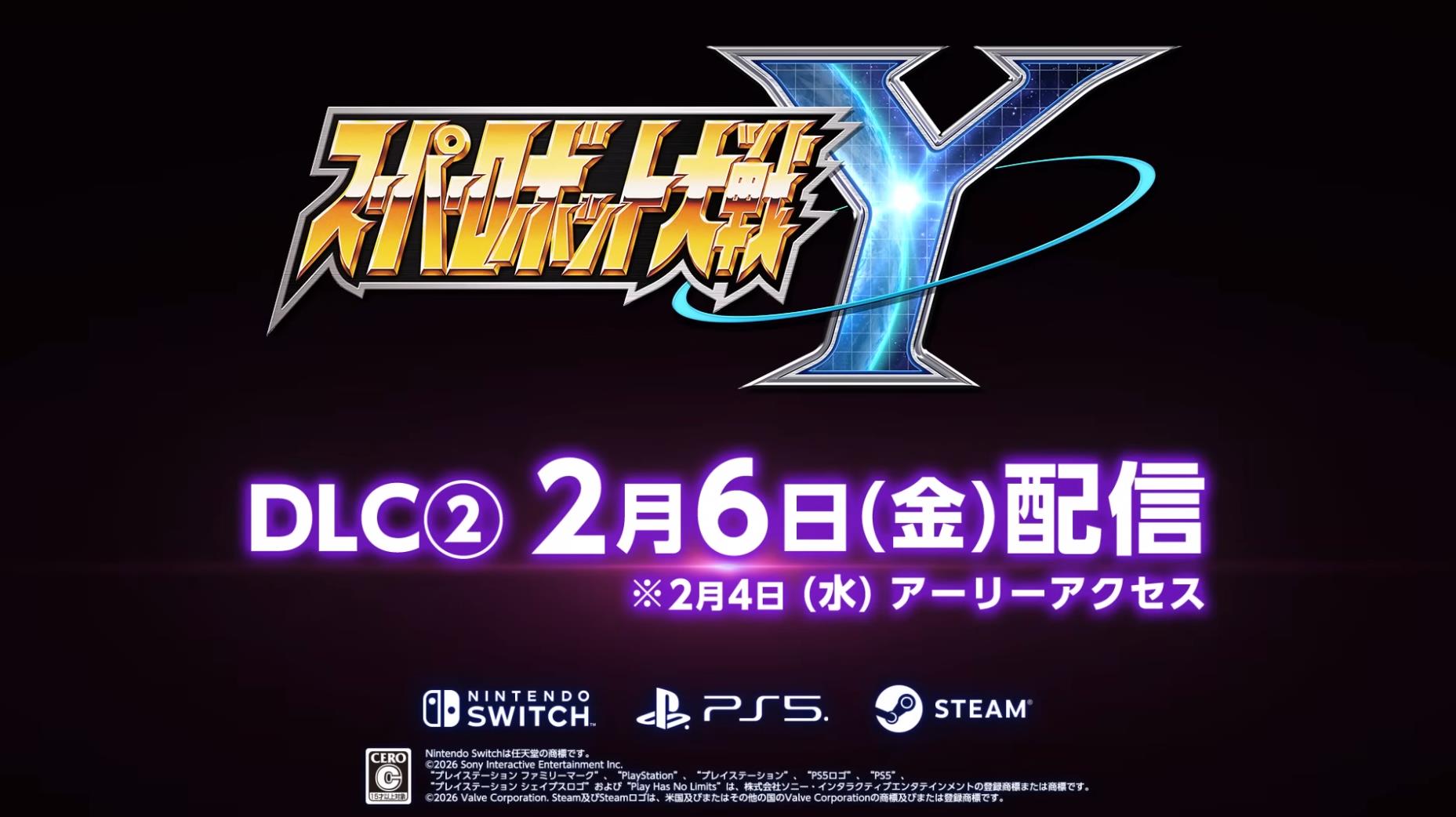 DLC②预计会在2月6日正式推出,购买豪华/终极版或DLC①&②组合包的玩家可在4号提前解锁。其中追加了16个区域任务和5台可玩机体。参战作品包括《钢铁杰克》《盖塔机器人:漆黑漂流者》《勇者传说》。《超级机器人大战Y》现已登陆PS5/NS/Steam。