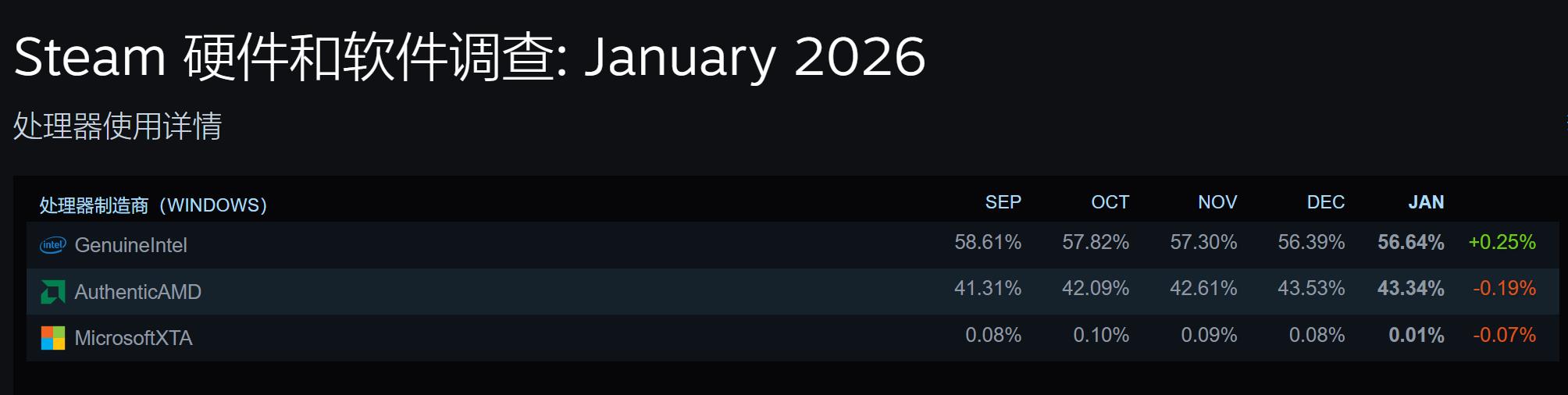 【2026年1月Steam硬件调查:RTX 4060获显卡榜首位】Steam官网公布了2026年1月份的玩家硬件调查数据。显卡方面,NVIDIA GeForce RTX 4060获得首位。两款50系显卡RTX 5070和RTX 5060的排名上升较为明显。目前显卡榜前五名依次为:RTX 4060(4.36%)、RTX 3060(4.28%)、4060 Laptop(3.99%)、RTX 3050(3.03%)以及RTX 5070(2.87%)。处理器方面上,Intel和AMD的占比分别为56.64%和43.34%。操作系统上,当前使用率最高的依旧是64位Windows 11。