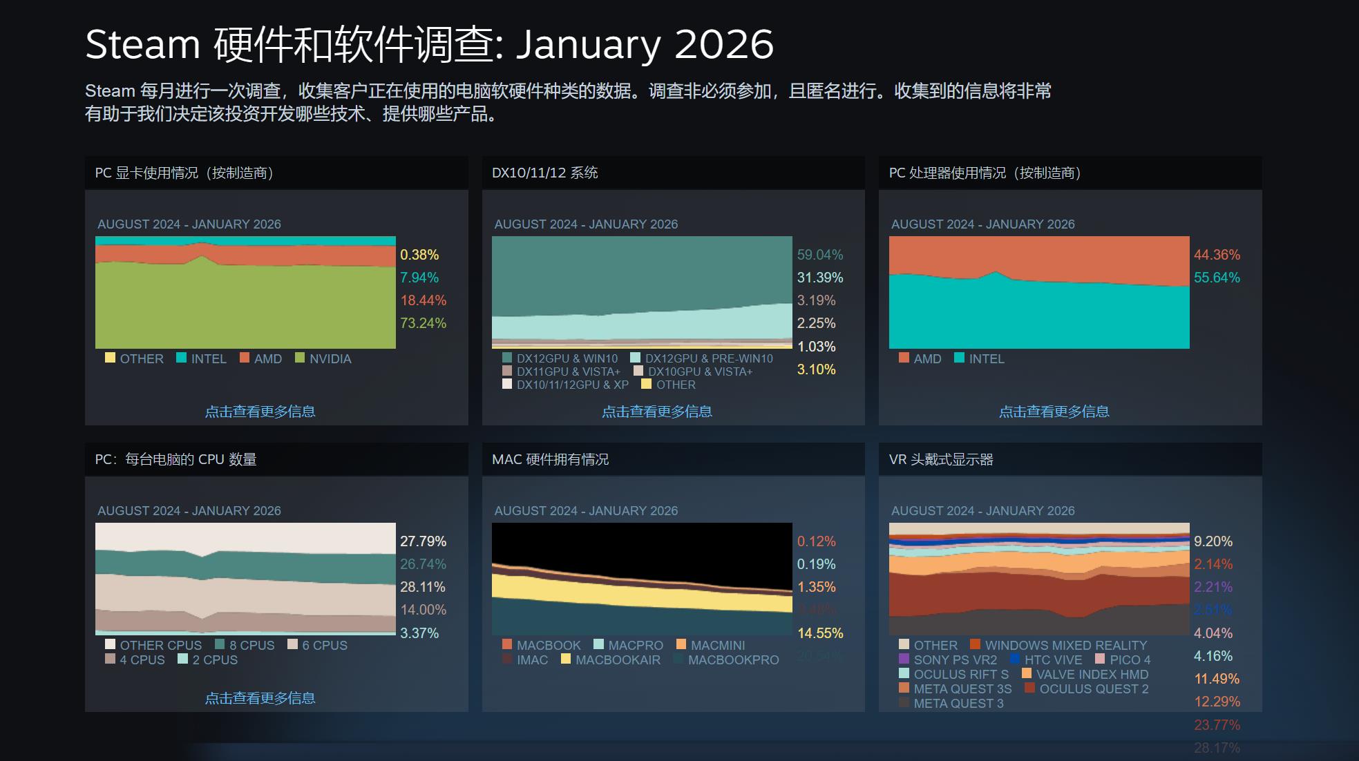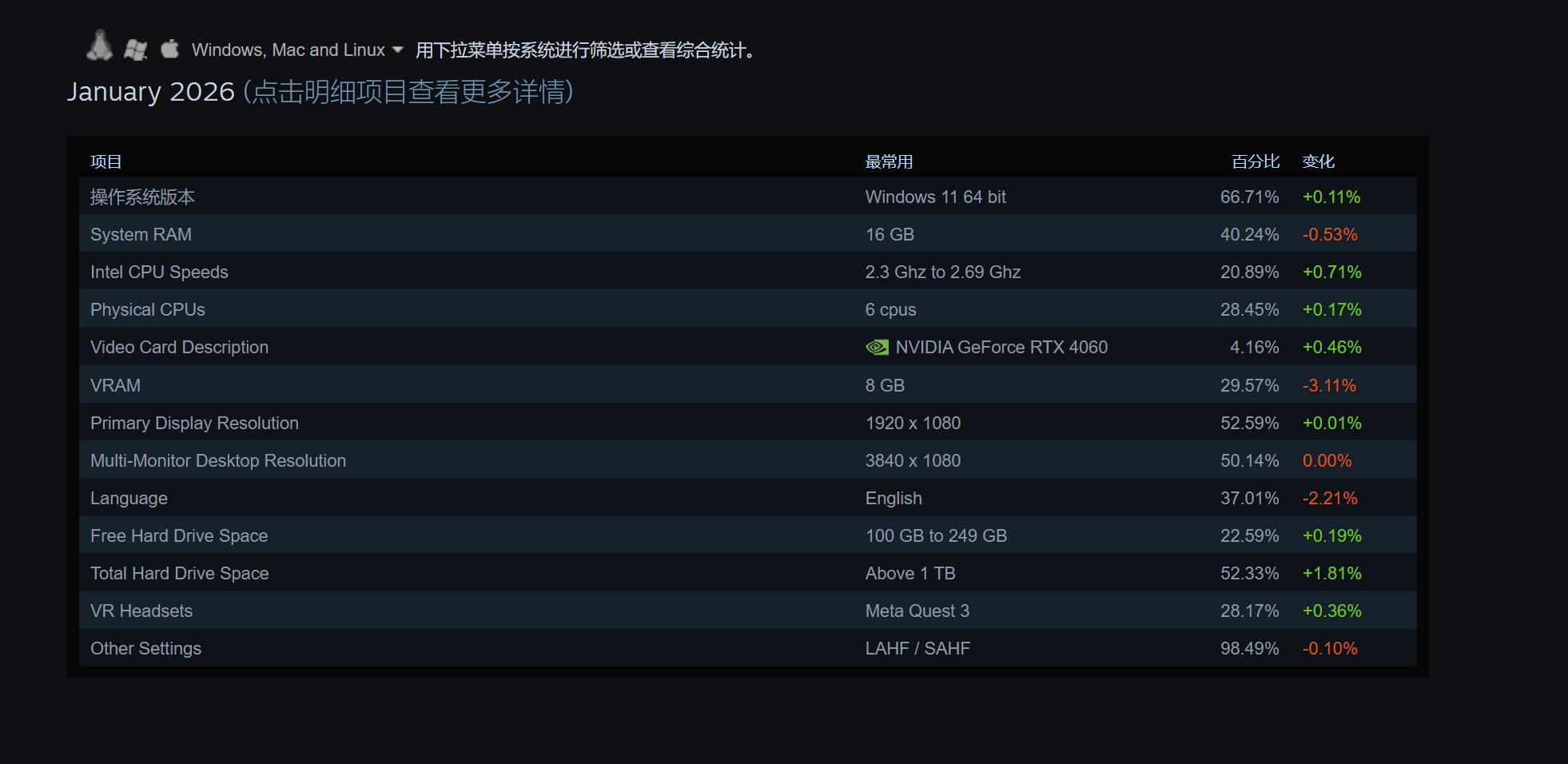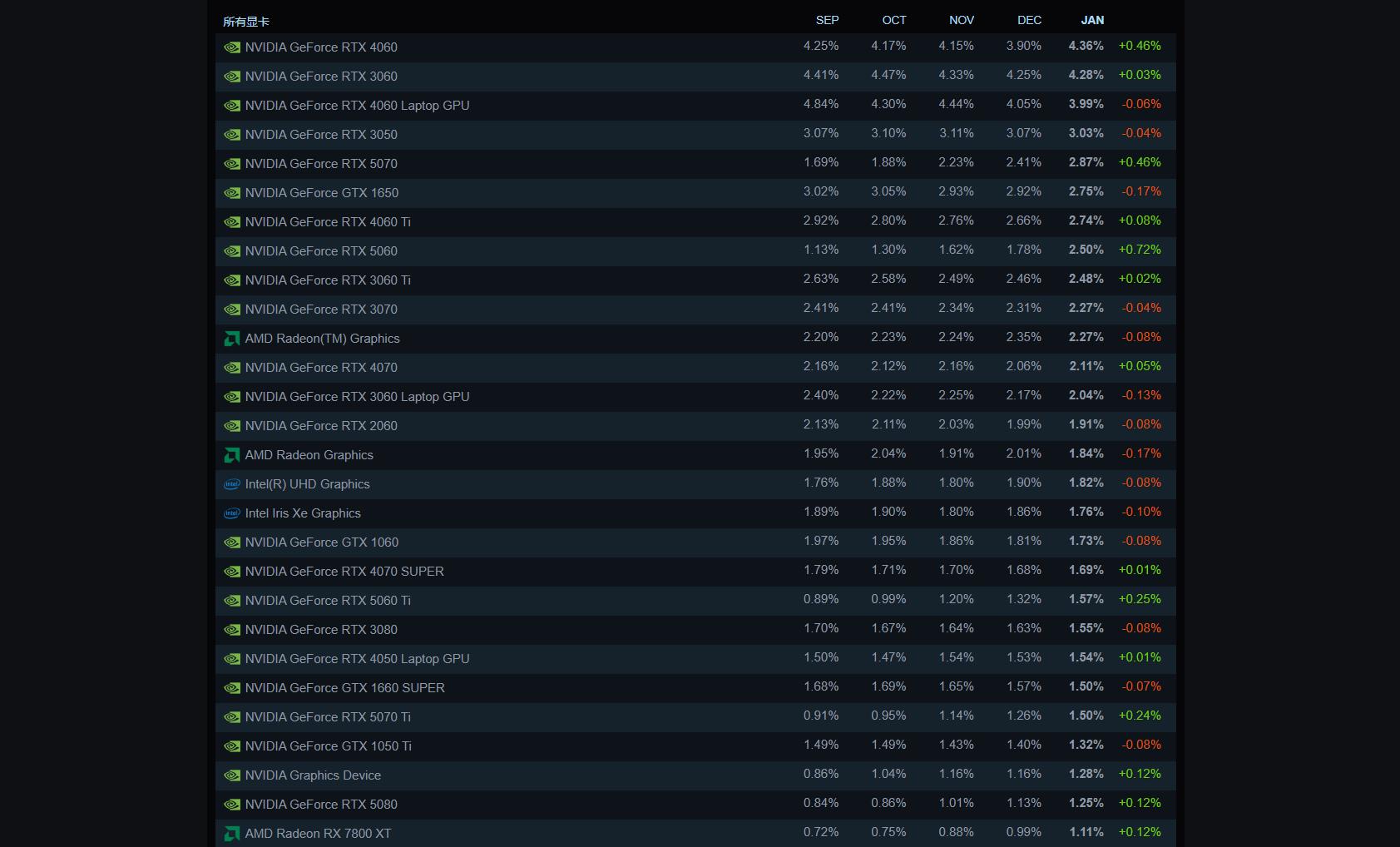 2026年1月Steam硬件调查:RTX 4060获显卡榜首位