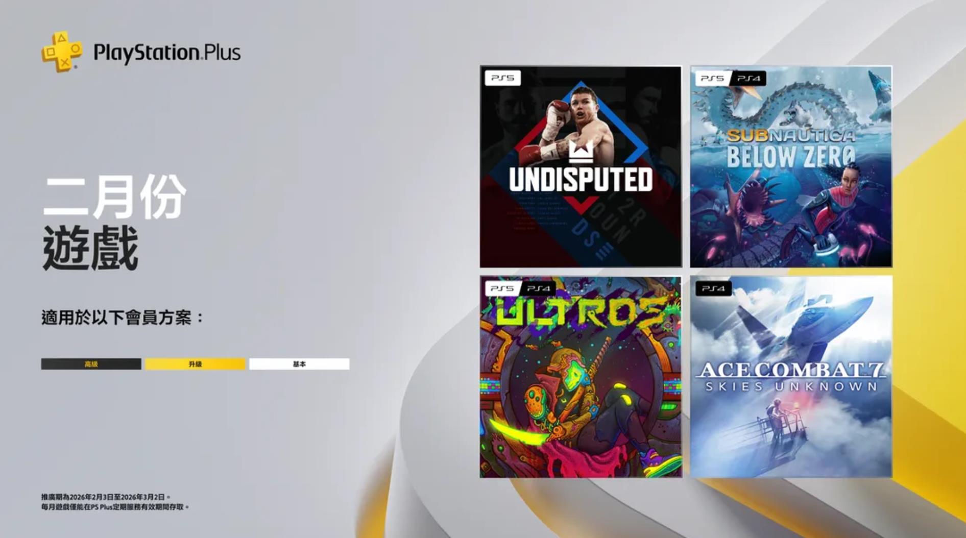【PS HK商店2月PS+会免游戏现已上线】2026年2月份PS HK商店PS+会免游戏(1档)已于今日上线。会员玩家将其添加到内容库,即可在订阅期间随时游玩。本期作品如下: PS5《Undisputed》 PS4/PS5《深海迷航:零度之下》 PS4/PS5《奥特罗斯(Ultros)》 PS4《皇牌空战7:未知的天空》 领取时间为2月3日~3月2日