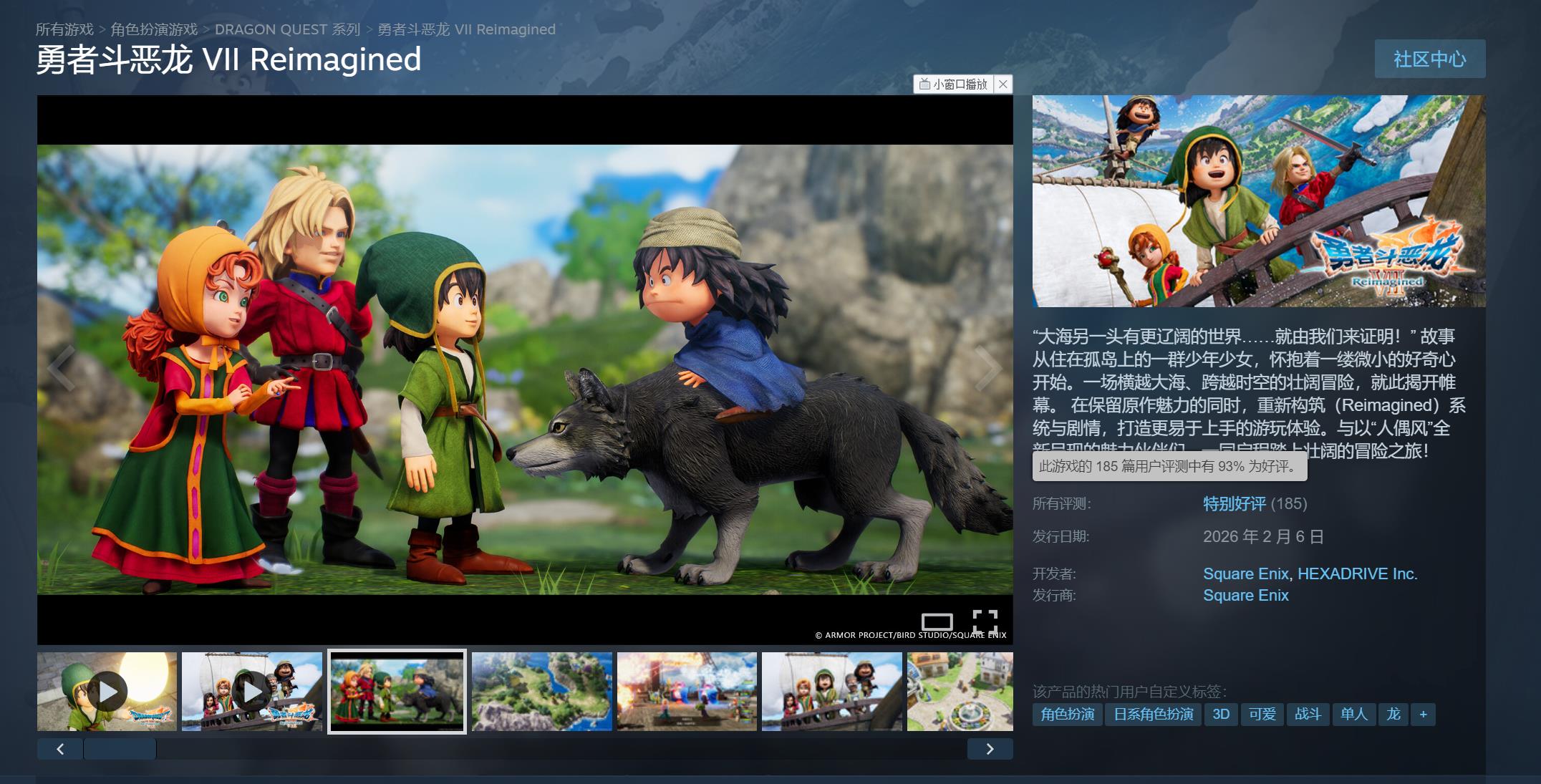 游戏Steam标准版将于明天(2月6日)解锁,不过购买了豪华版的玩家已可于昨天提前进入游戏。本作在Steam上现已累计185篇评测,玩家好评率93%,整体为“特别好评”。不少玩家对本次重制版的整体完成度给予肯定,认为全新画风与多项人性化改进让游戏体验得到了提升。《勇者斗恶龙7:Reimagined》已于此前上架了试玩Demo,感兴趣的玩家也可在体验后再决定是否入手。