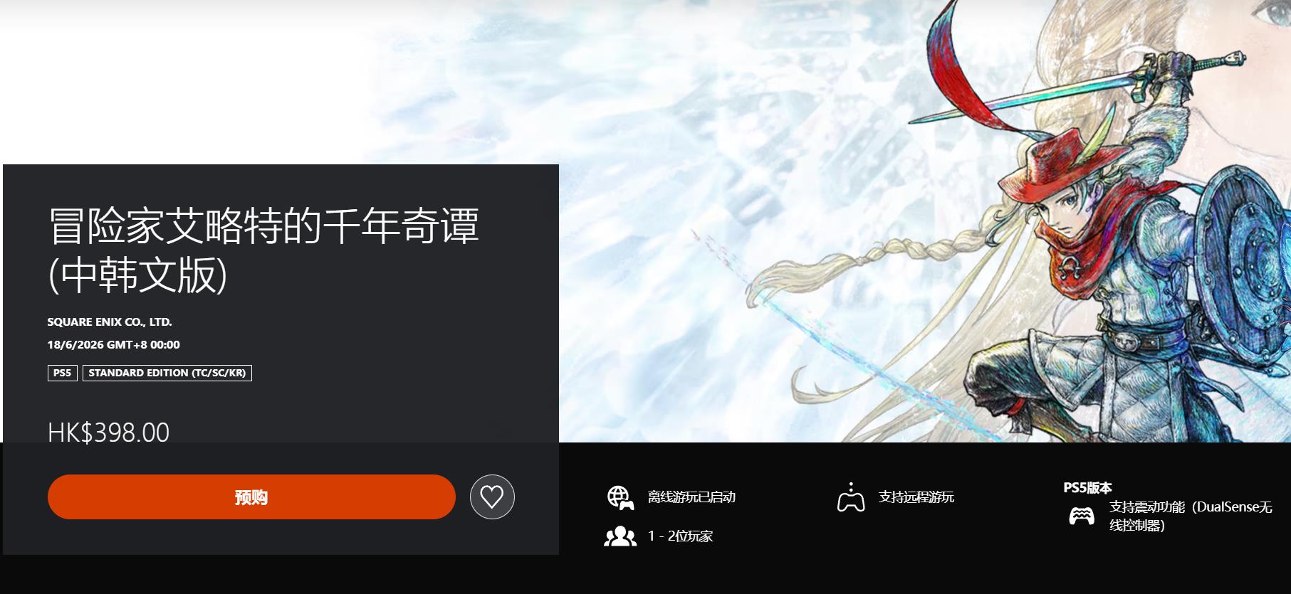 《冒险家艾略特的千年物语》现已开启预约,Steam国区标准版售价298元,豪华版348元,主机平台上的标准/豪华版定价分别为398HKD和468HKD(任天堂HK商店暂未上架)。预购可获得特典装饰品“启程胸针”和魔石“剑魔石(攻击力提高)”,豪华版额外附送 “妖精手镯”“樱花脚环”“罗洁尔戒指”等装饰品。