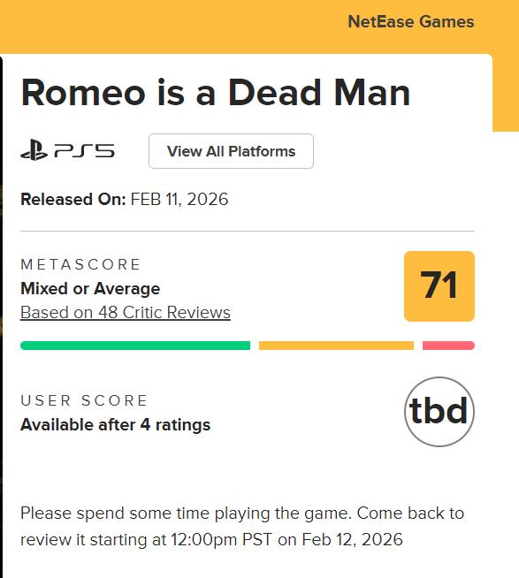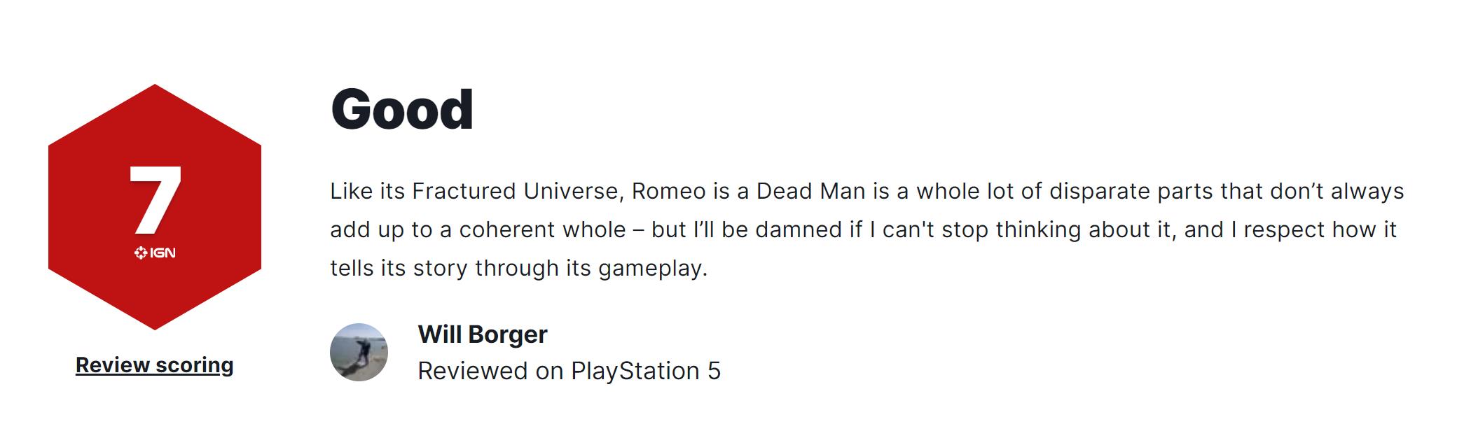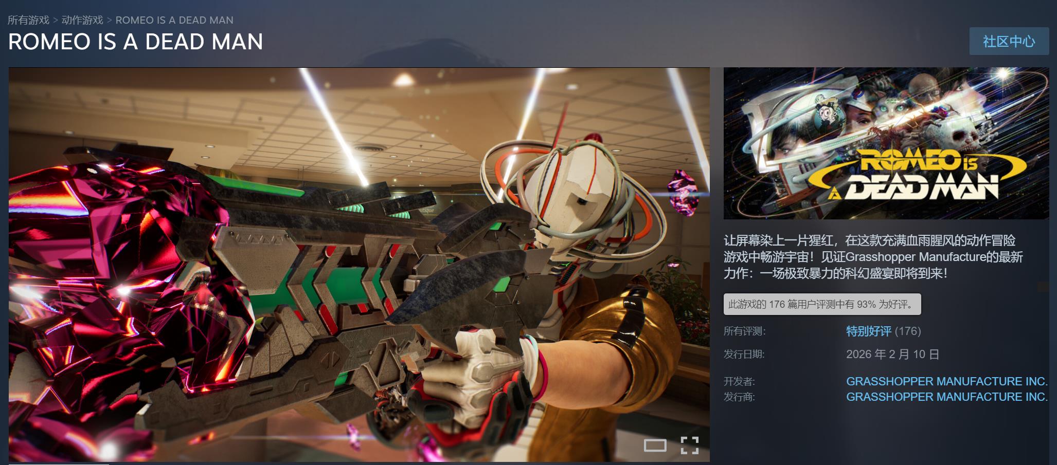 【草蜢工作室新作《罗密欧是个绝命侠》MC评分71,Steam上获玩家“特别好评”】由须田刚一领衔的草蜢工作室(Grasshopper Manufacture)所打造的新作《罗密欧是个绝命侠》现已发售。本作是一款第三人称单人动作冒险游戏,玩家将操控主角“罗密欧・观星者”,开启一段分为多个章节的冒险。截至目前,游戏在Steam上已有176篇评测,玩家好评率93%,整体为“特别好评”。