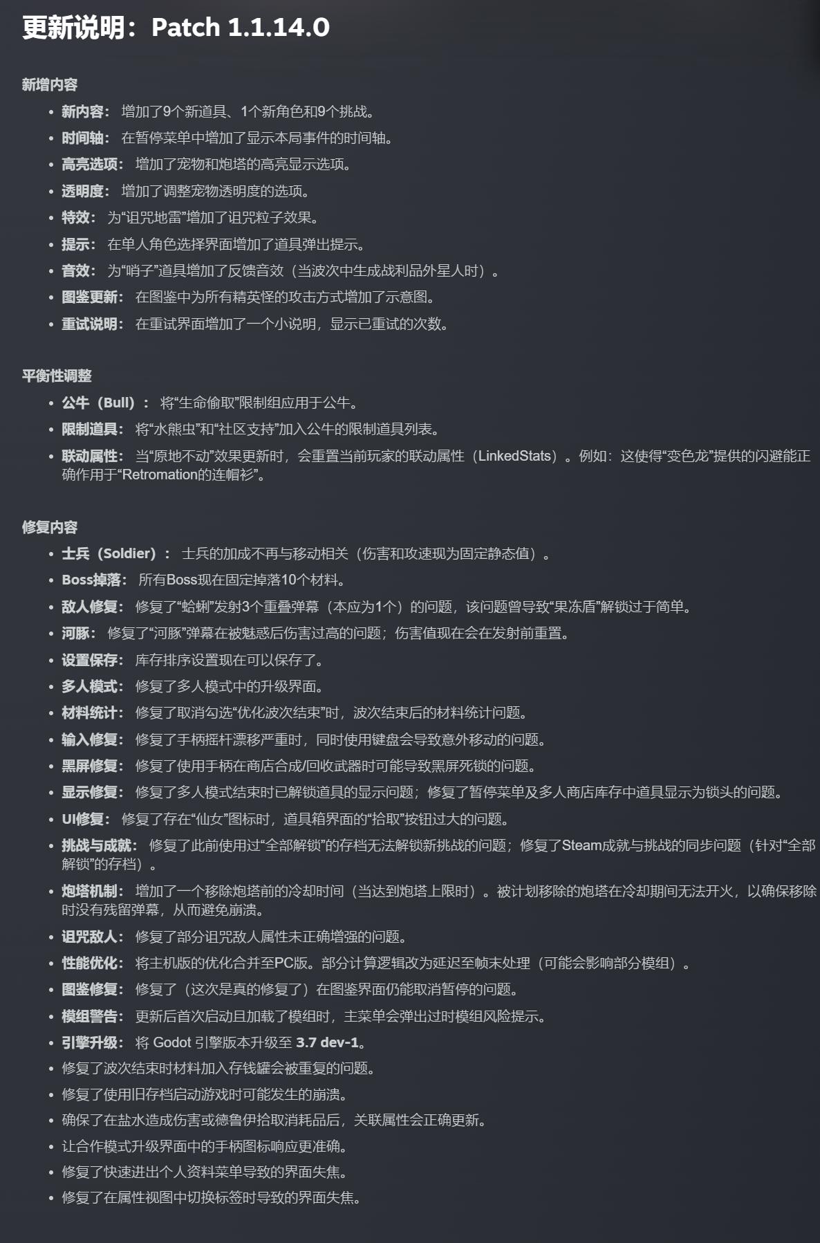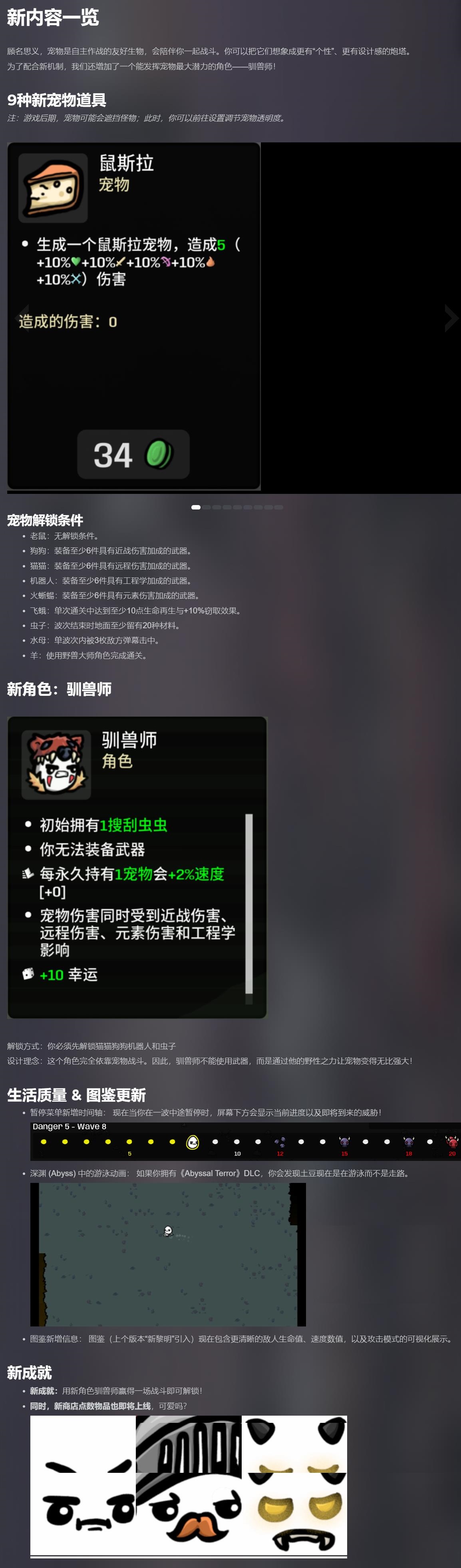 【《土豆兄弟》“张牙舞爪”免费更新现已在PC平台上线】《土豆兄弟》免费更新“张牙舞爪”现已登陆正式版。此次更新带来了9种新宠物道具、新角色驯兽师、生活质量&图鉴更新、1个新成就以及新的点数物品等新要素。其他平衡性调整以及修复等内容详见附图。“张牙舞爪”目前在PC(Steam和Epic)上推出,主机版稍后上线。 *点击首图查看视频