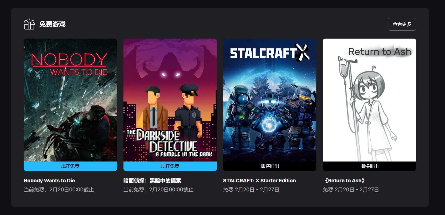 【Epic喜+2】像素风解谜游戏《暗面侦探:黑暗中的摸索》和叙事冒险游戏《Nobody Wants to Die》 现已可在Epic商店中免费领取,2026年2月20日00:00截止,领取后永久入库。下周免费游戏《STALCRAFT: X Starter Edition》和《灰烬回归(Return to Ash)》。