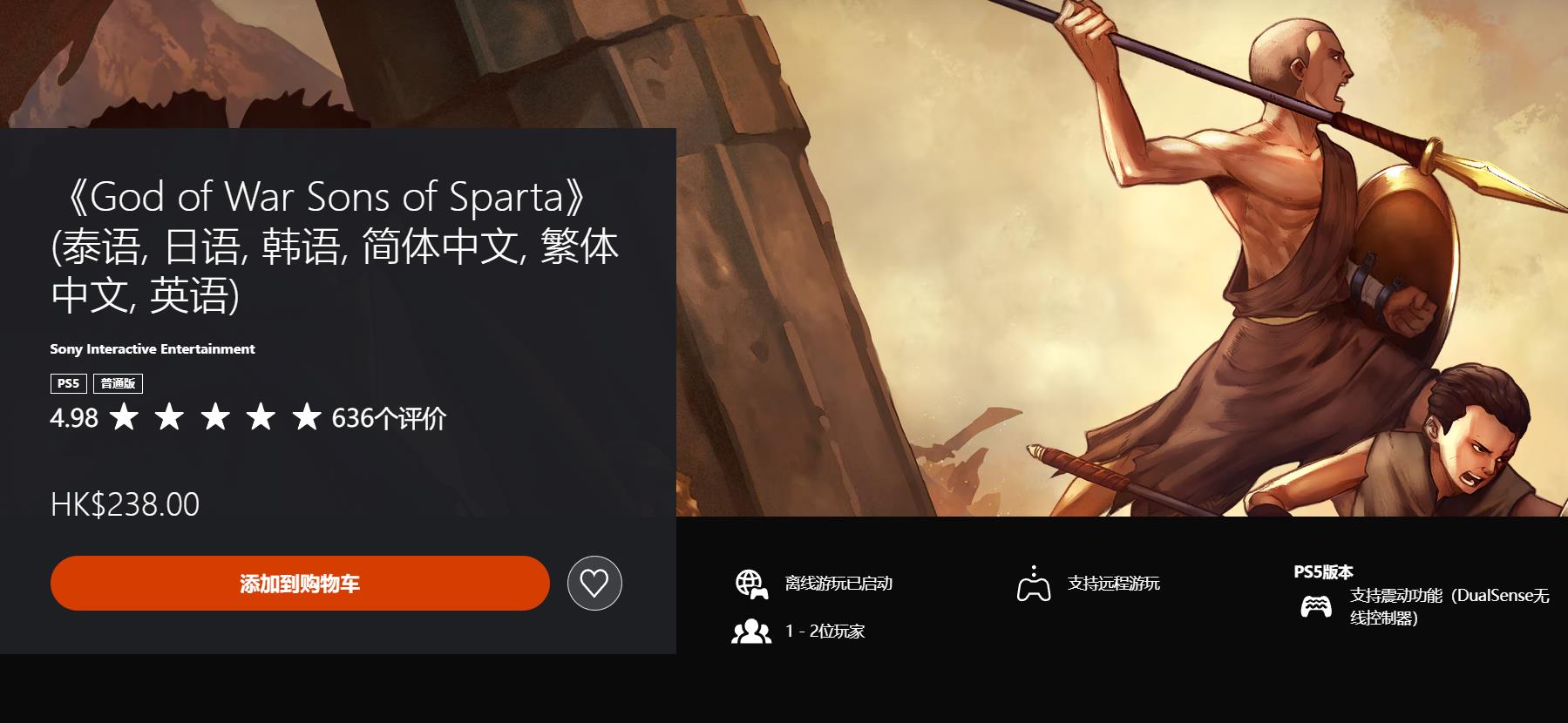 《战神:斯巴达之子》标准版售价238HKD,豪华版308HKD,额外附送艺术集、原声带、游戏内道具和货币以及PSN虚拟形象等内容。游戏支持中文。