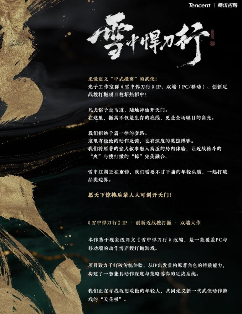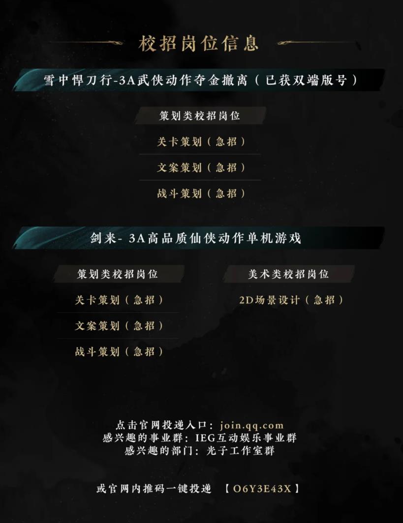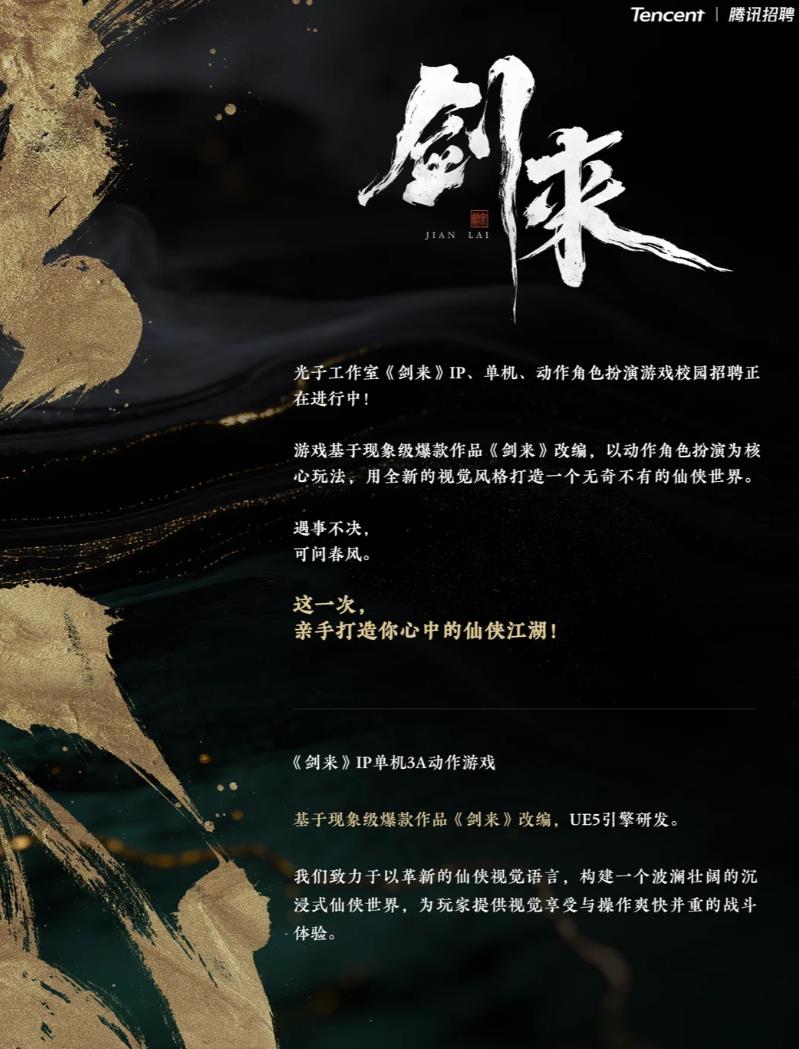 腾讯光子工作室为3A仙侠动作单机游戏《剑来》发布招聘信息