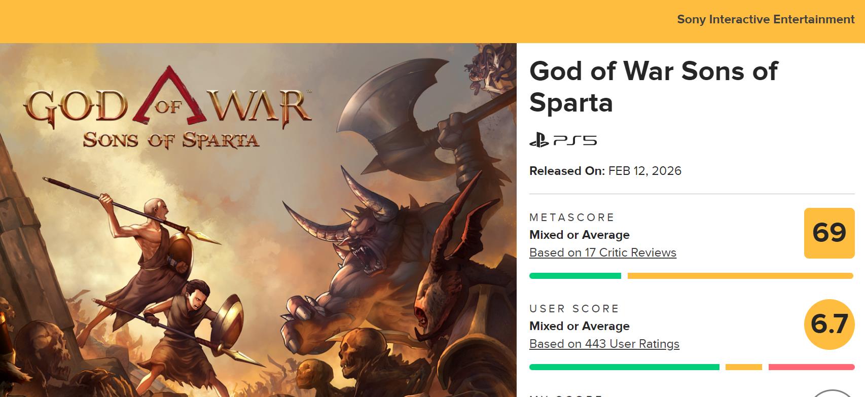 【系列最低!《战神:斯巴达之子》MC媒体均分69】2D横版动作游戏《战神:斯巴达之子》已于日前登陆PS5。目前本作在MC上的媒体均分为69(暂收录19家媒体),这也使其成为了战神系列中分数最低的作品,部分媒体的评分如下:
