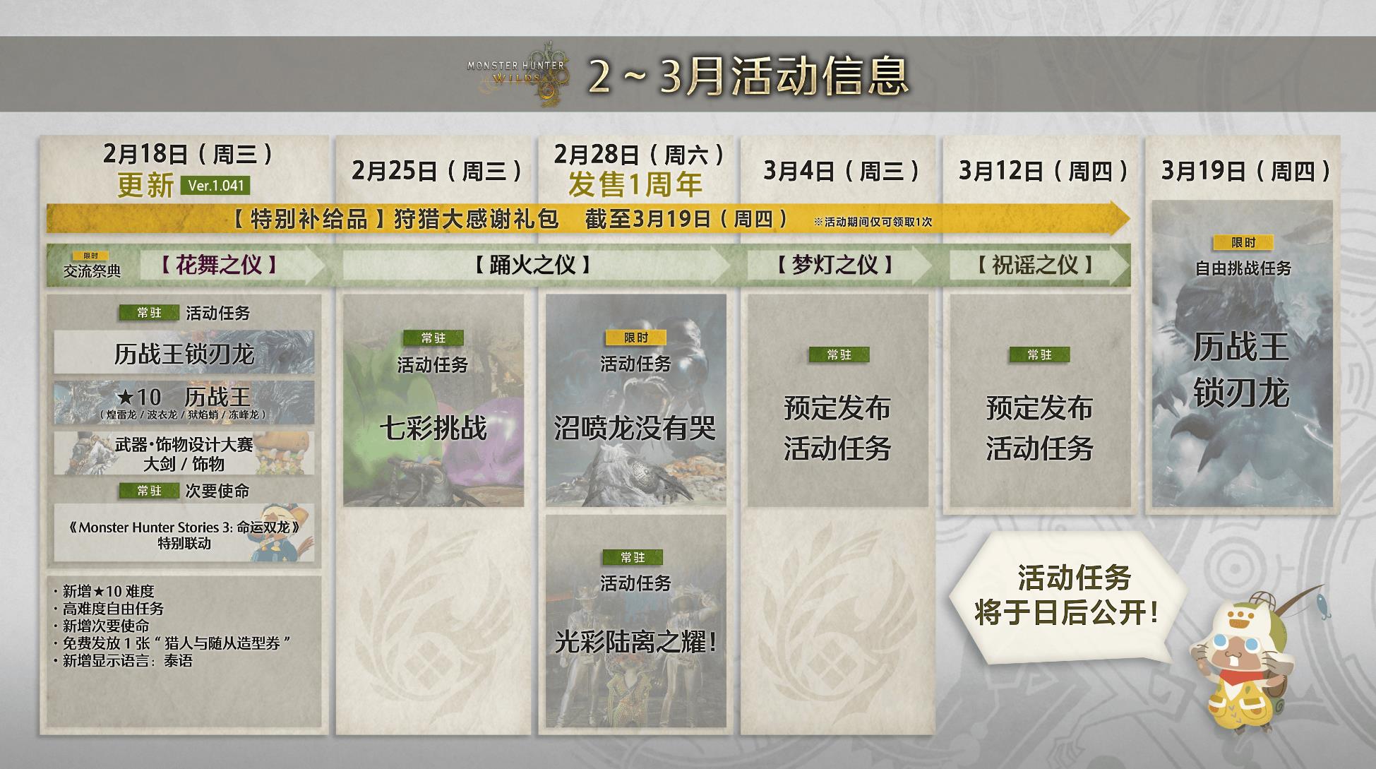 【《怪物猎人:荒野》最终更新今日上线!碎裂封镜之剑帅气登场】《怪物猎人:荒野》最终更新(1.041)今日正式上线。主要内容包括:历战王锁刃龙、★10历战王、武器&饰物设计大赛作品实装、《怪猎物语3》联动等内容。3月19日前,还可领取特别补给品“狩猎大感谢礼包”。详细内容和后续活动信息详见附图。此外,一同推出的还有游戏品质改善,其中对游戏实施了进一步的优化措施。