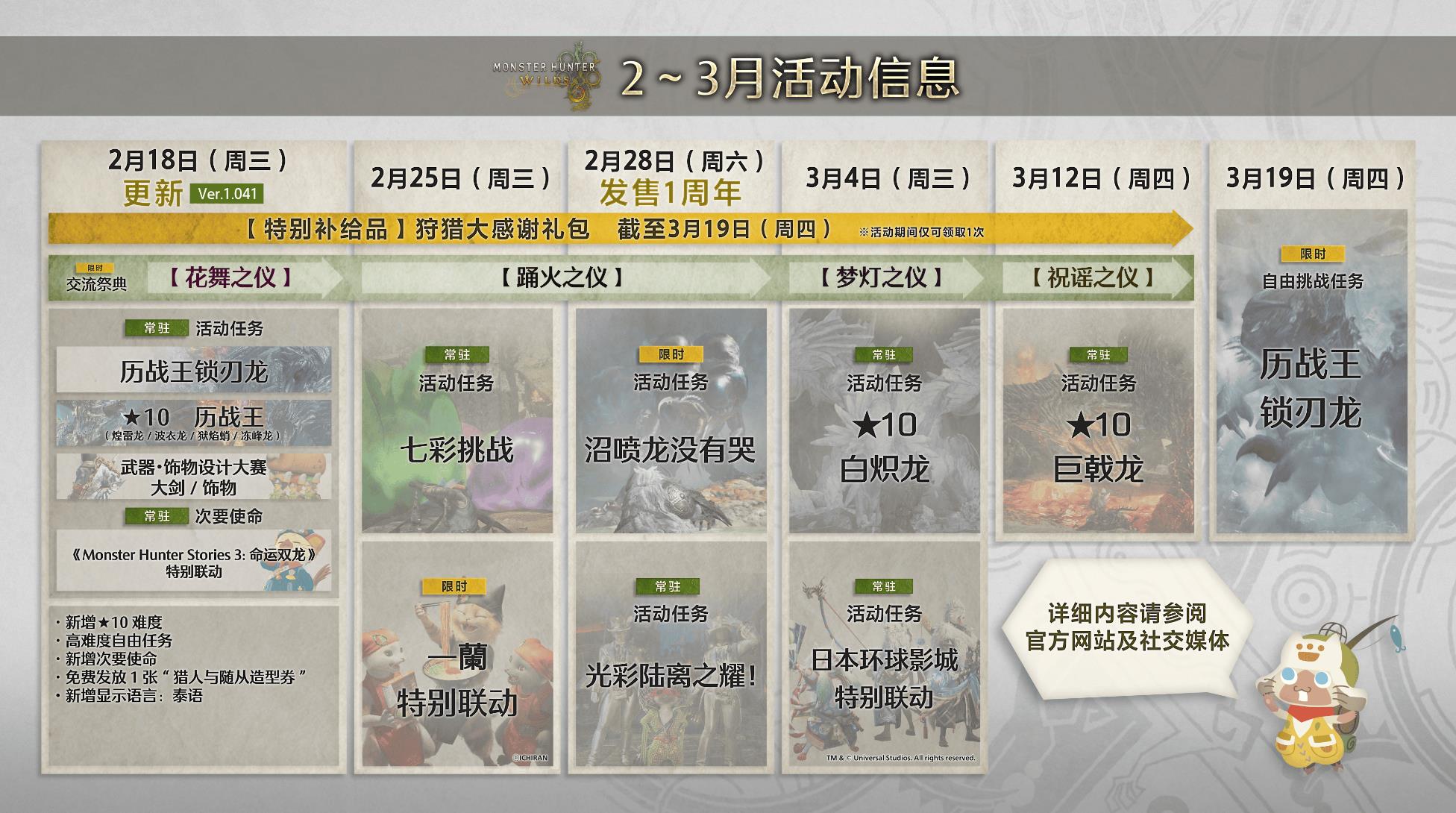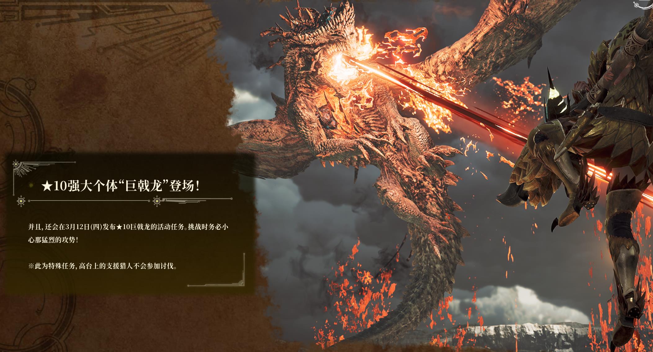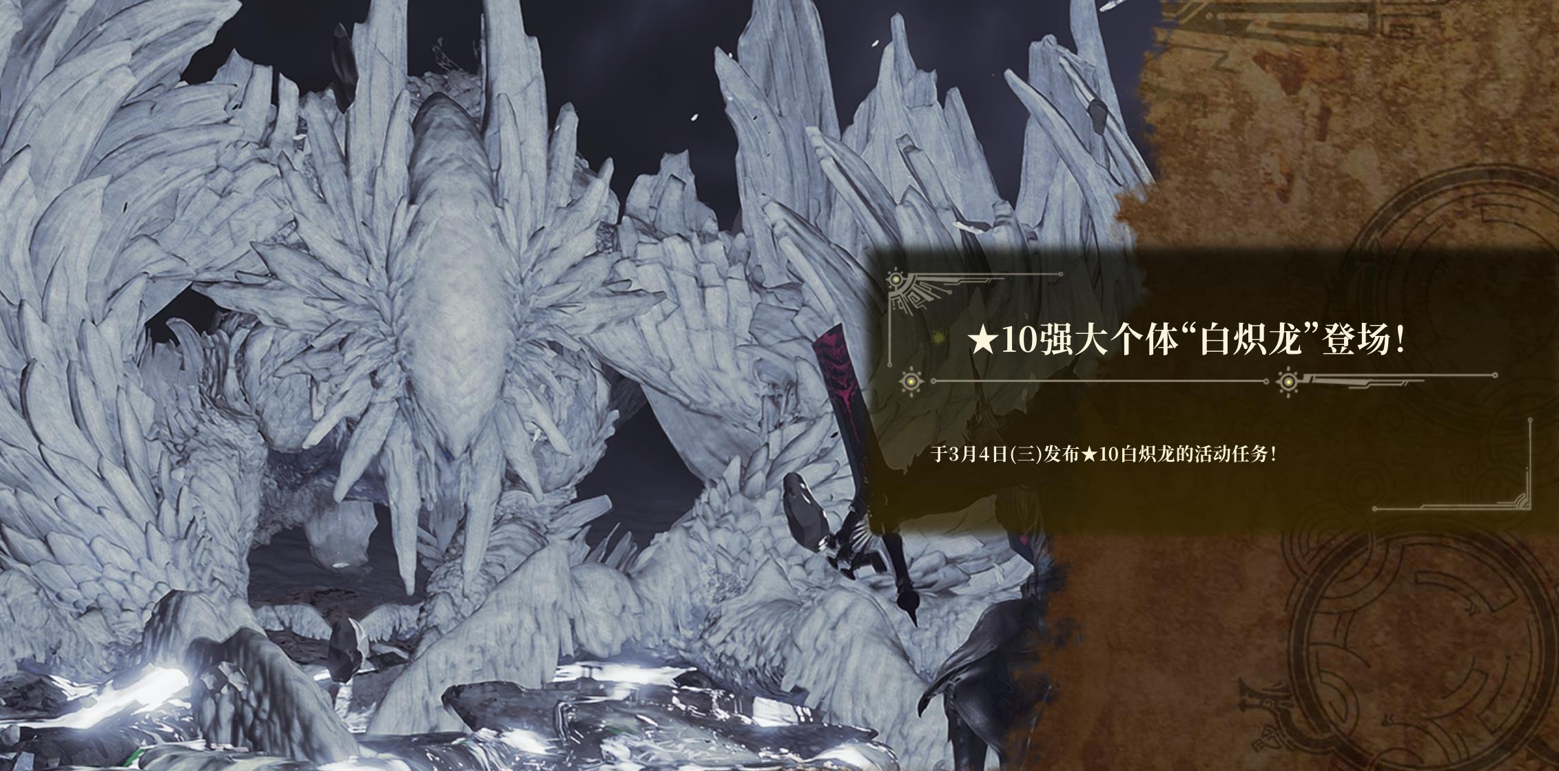 最后,官方确认☆10白炽龙和☆10巨戟龙将分别在3月4日和3月12日到来。《怪物猎人:荒野》最终更新已于近日上线,目前大型扩充包正在开发中,详细信息预计会在今年夏季公开。