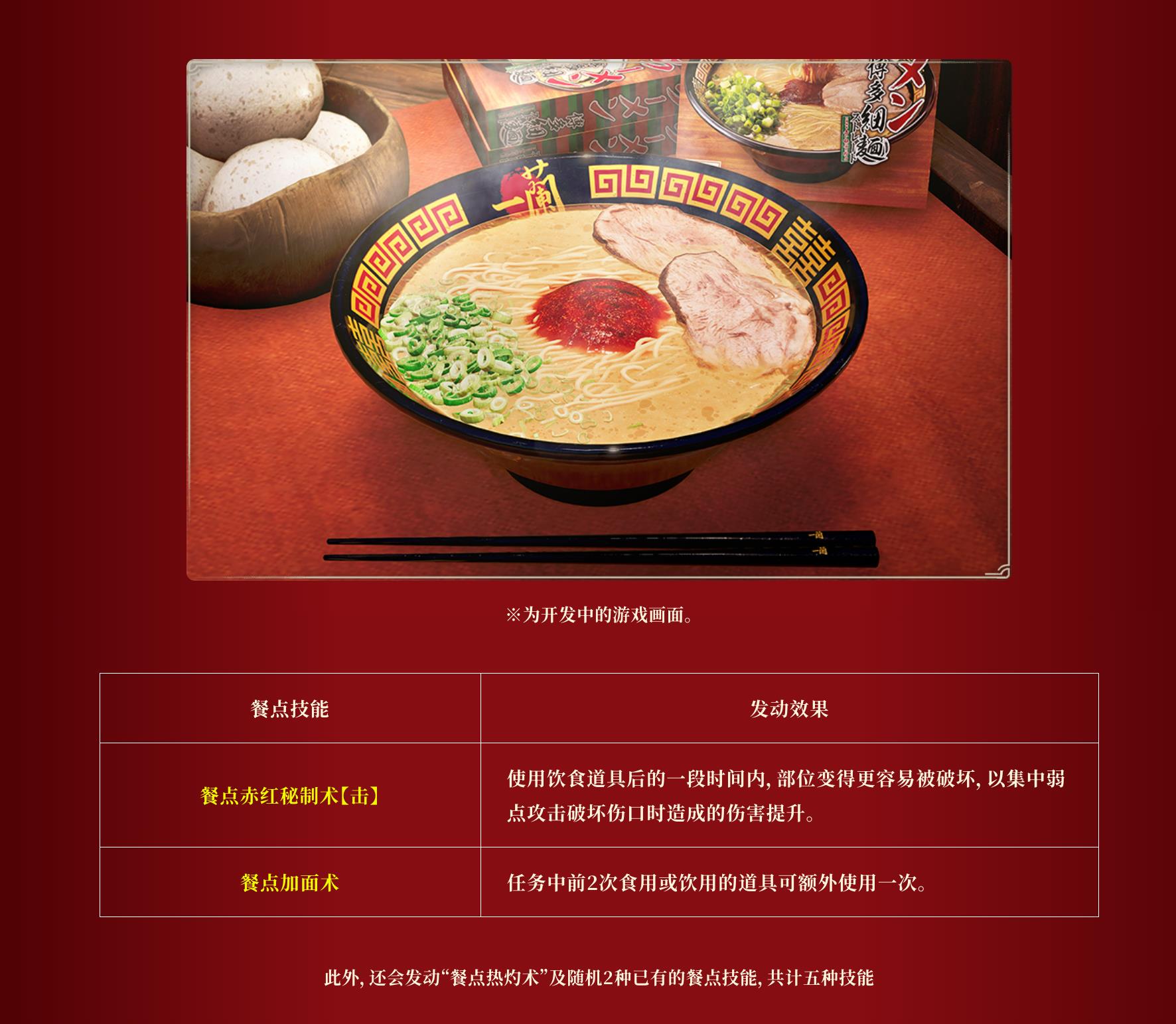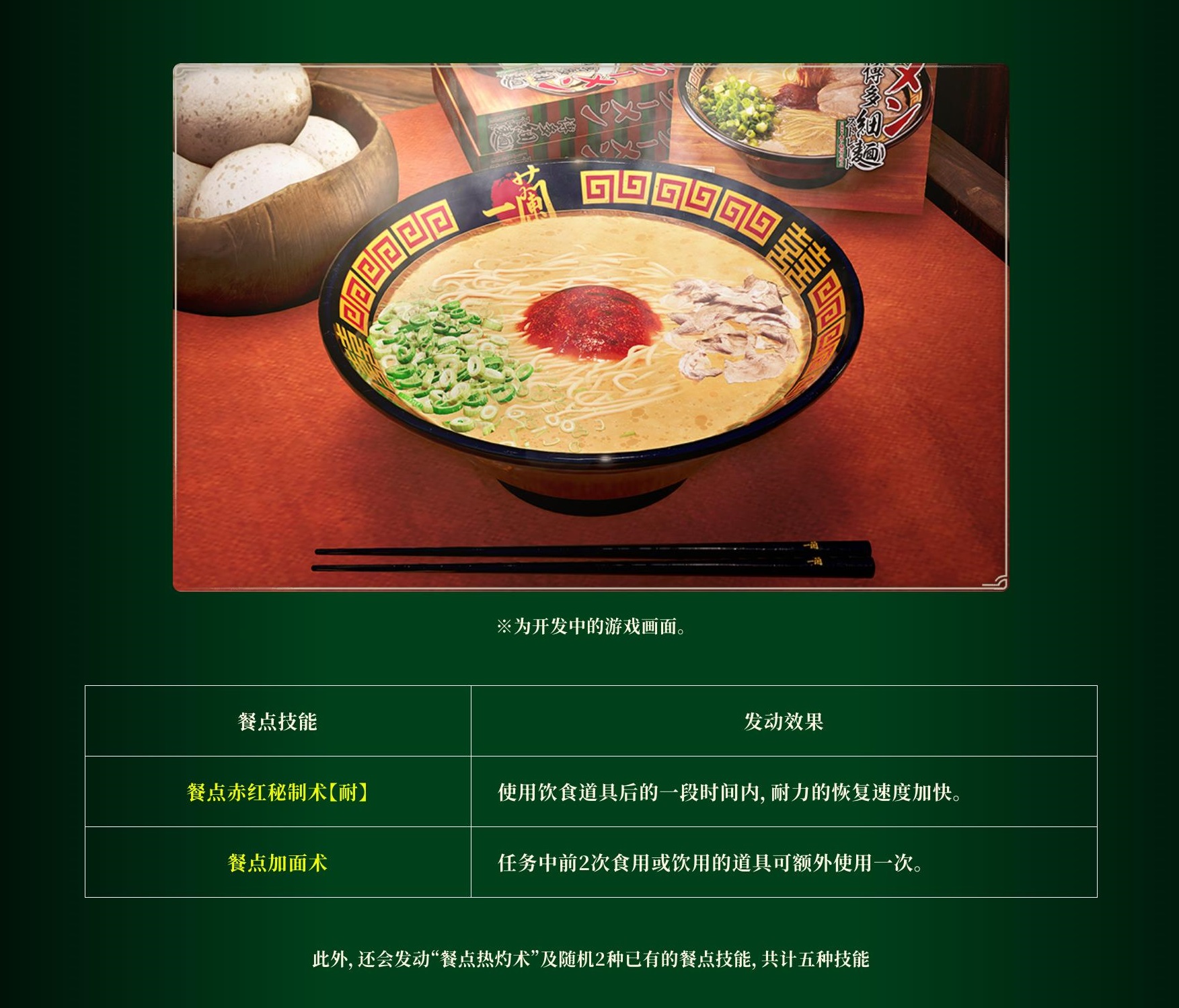 【《怪物猎人:荒野》USJ和一蘭拉面等联动内容公开】Capcom在今日的怪猎节日活动中带来了《怪物猎人:荒野》的一些新情报。首先,本作将与一蘭拉面展开联动。2月25日8:00~4月1日7:59期间,一蘭店员“一兰”会出现在大集会所的用餐区。玩家领取专属餐券可在用餐区品尝“天然豚骨汤拉面”“100%不使用豚骨的拉面”(餐点技能和发动效果详见附图)。
