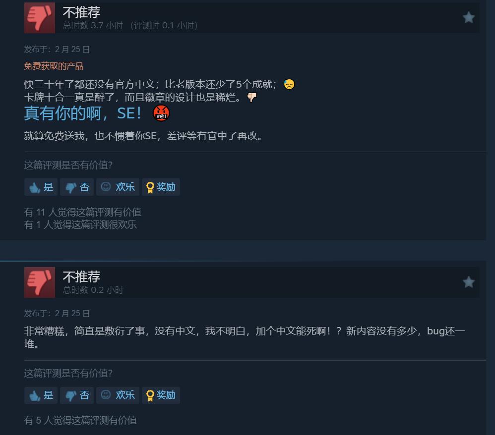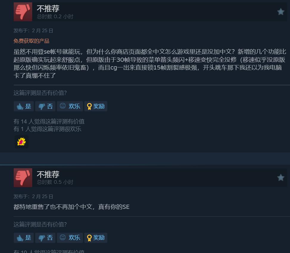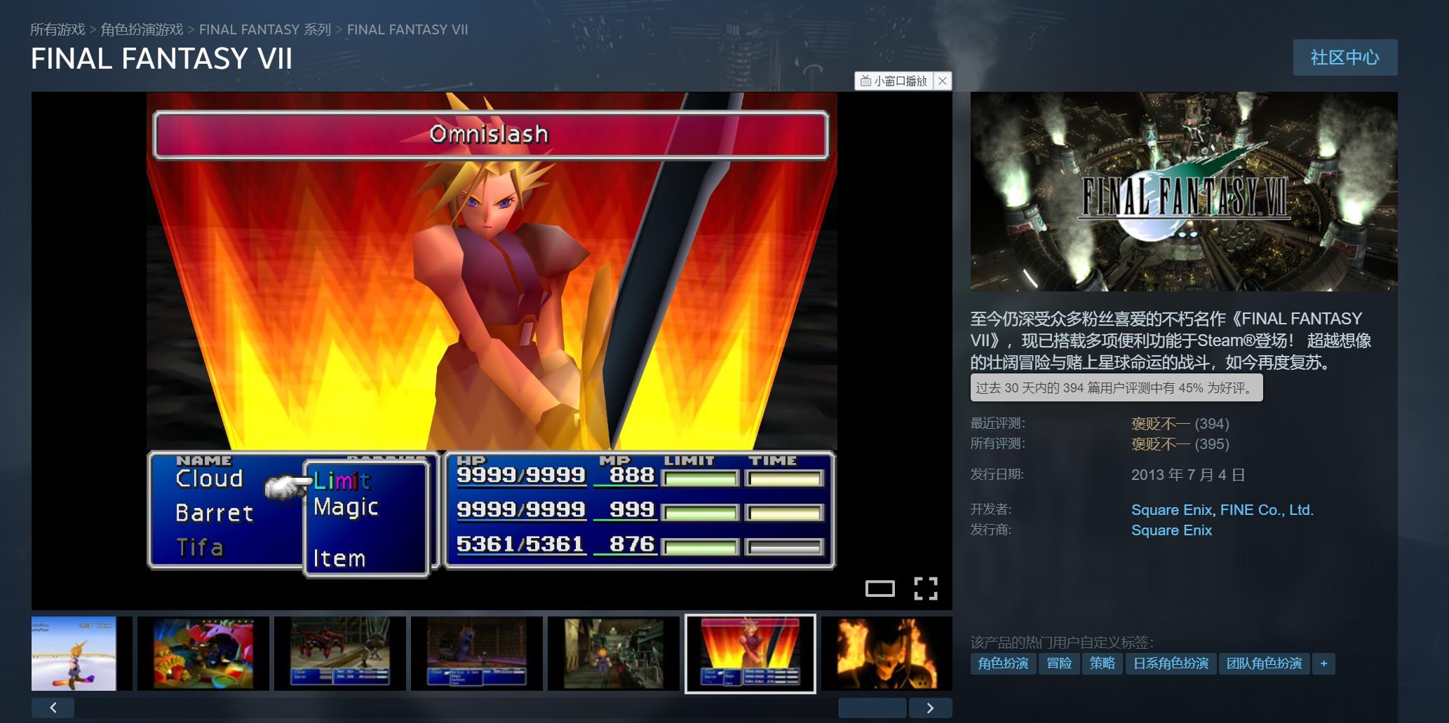 目前《最终幻想7》在Steam上已有395篇评测,玩家好评率45%,整体为“褒贬不一”。据悉游戏新老版本不仅存档不互通,而且还少了5个成就,更重要的是,即便游戏页面提供了全中文介绍,但此次的重新发行未对游戏内提供官方中文提供支持。《最终幻想7》Steam国区售价40元,购买过2013版的玩家可免费升级。