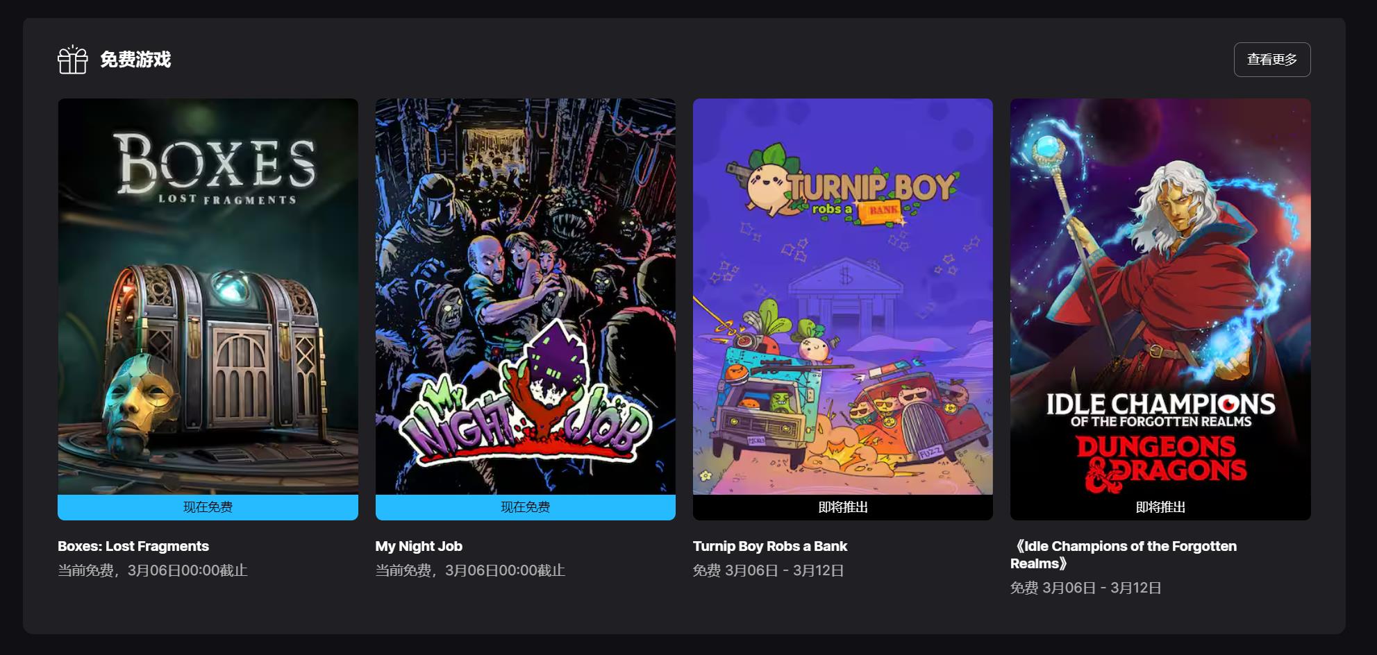 【Epic喜+2】经营管理模拟游戏3D密室逃脱解谜游戏《Boxes: Lost Fragments - 盒子:丢失的碎片》和平台动作游戏《My Night Job - 我的夜间工作》现已可在Epic商店中免费领取,2026年3月6日00:00截止,领取后永久入库。下周免费游戏《Turnip Boy Robs a Bank》和《Idle Champions of the Forgotten Realms》。