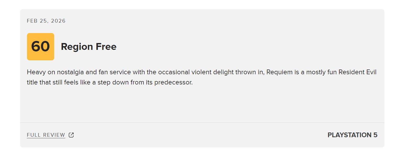 【过度怀旧成扣分点!《生化危机:安魂曲》获MC当前唯一6分】《生化危机:安魂曲》媒体评测已于昨晚解禁,目前在MC上它以88分的成绩成为系列继《生化危机4》后分数最高的正统续作。现阶段本作的媒体评分普遍在8~10分之间,当前仅有一家媒体Region Free给予了最低的6分评价。