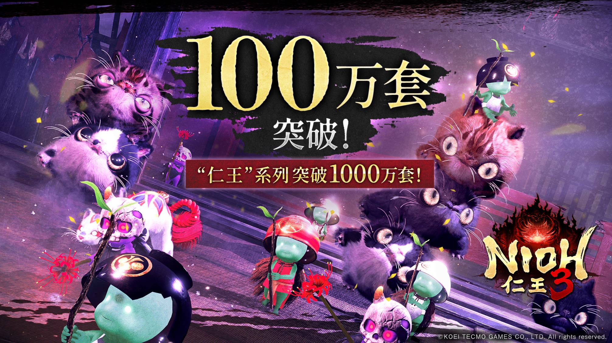 【《仁王3》销量破百万!官方将向玩家赠送万雷防具套装】光荣特库摩上周宣布《仁王3》全球累计销量突破100万,《仁王》系列销量超过1000万份。官方今日发文再次感谢玩家的支持,并表示为庆祝达成这重要的里程碑,将会在在日后以免费更新的形式推出特制防具组——“万雷防具套装”作为纪念特典DLC。动作RPG《仁王3》现已登陆PS5和Steam。