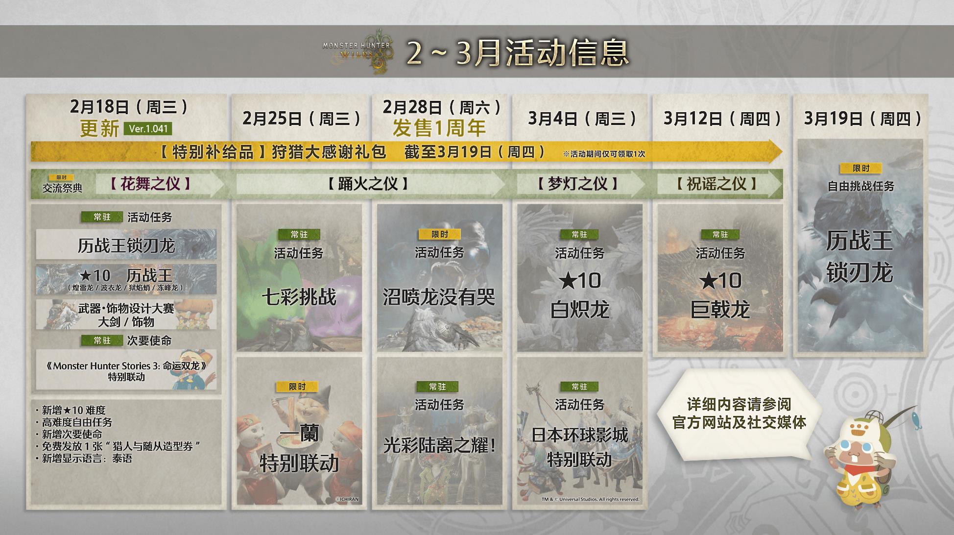 《怪物猎人:荒野》作为系列最新作首次加入了跨平台功能,并在发售后追加了中文配音。官方已于此前确认本作大型拓展包正在开发中,具体信息预计会在今夏公布。此外,★10巨戟龙和白炽龙任务,以及最新联动等内容也将会在近期上线,日程安排详见附图。