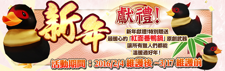 PSV游戏《怪物猎人:边境G》从2月4日维护后起至3月17日维护前将推出超人气的应节武防具“红面番鸭锅”!在今年2月的Daily Bonus中,猎人玩家第五次登入游戏时,就能领取到承接“姜母鸭的活跃”活动用道具“姜母鸭的锅具”。只要完成该任务,猎人玩家就能得到生产新狩猎笛武器“生姜母鸭”的生产素材“姜姜姜生产券”与脚部装备“奔跑姜母鸭‧黑”的生产素材“跑姜生产券”。若想强化“生姜母鸭”与“奔跑姜母鸭‧黑”,就要前往2月份展开的第13回大航祭,因为猎人制霸第20条及25条航路时分别可获得强化素材“姜母鸭的回忆”。