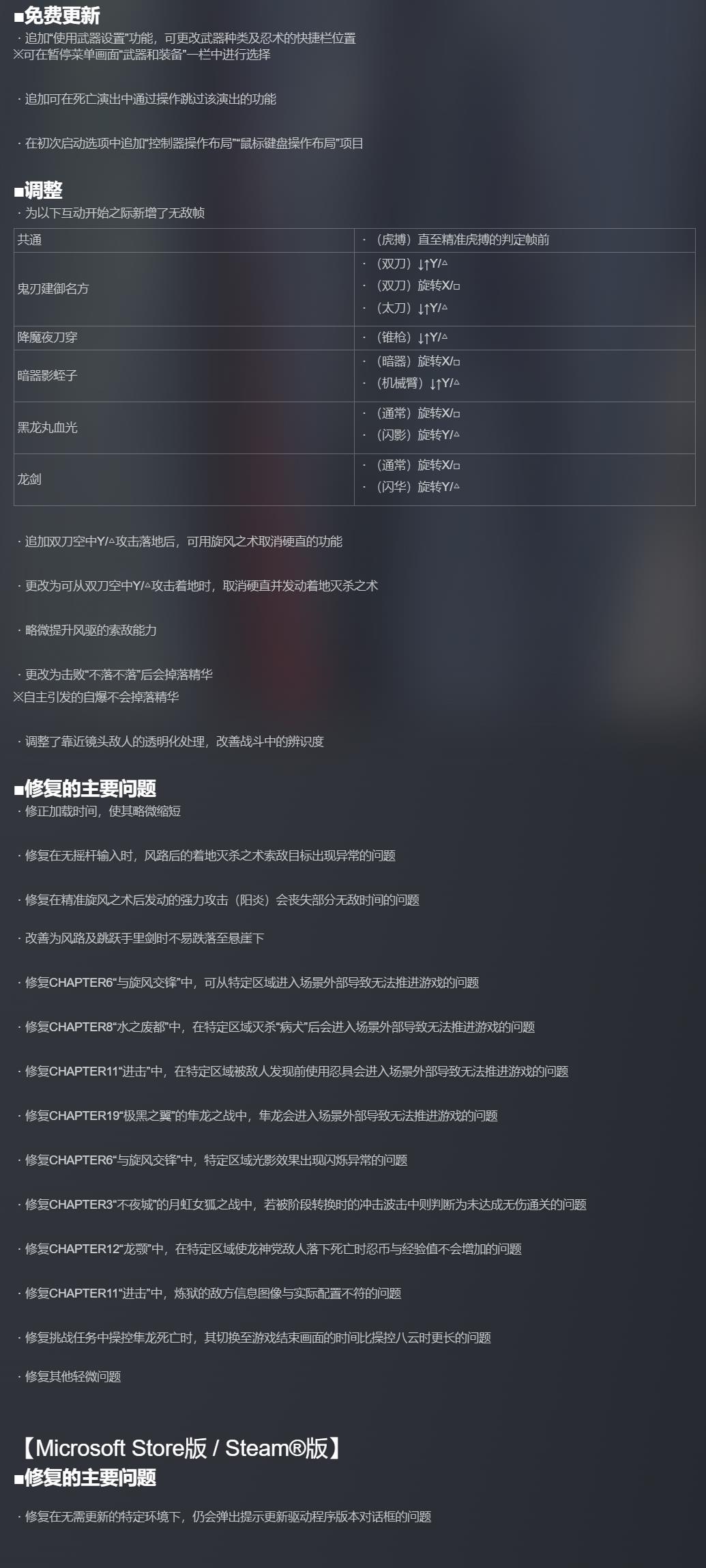 与此同时,本作还推出了免费更新。追加了“使用武器设置(可更改武器种类及忍术的快捷栏位置)”等功能。此外,还有一些内容上的调整和修复,详细说明参考附图。