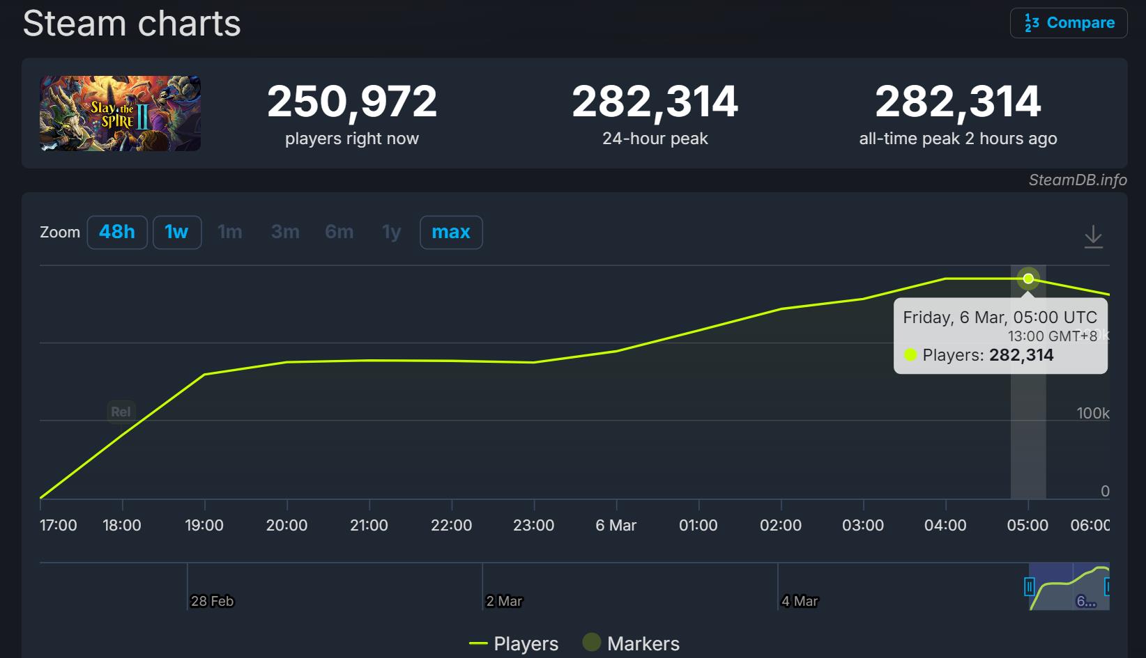 【《杀戮尖塔2》玩家峰值持续攀升!开发商表示已创肉鸽类游戏最高纪录】肉鸽卡牌游戏《杀戮尖塔2》抢先体验版已于今日在Steam上推出。本作上线后,玩家在线游玩峰值数持续走高,截至目前已达到282314人。