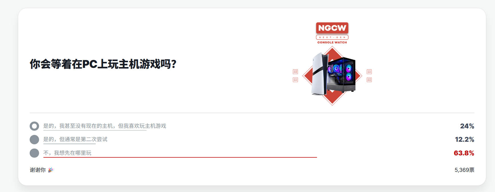 【投票显示超半数玩家不会在PC上玩主机游戏】IGN近日发布投票,询问玩家是否会在PC上玩主机游戏。有5368名玩家参与投票。其中24%的玩家选择自己目前没有主机,会选择在PC上尝试主机游戏,12.2%的玩家表示自己通常会在PC上对主机游戏进行再次游玩,63.8%的玩家表示自己只会考虑在对应主机平台进行游玩。如果是你,你会如何选择呢?