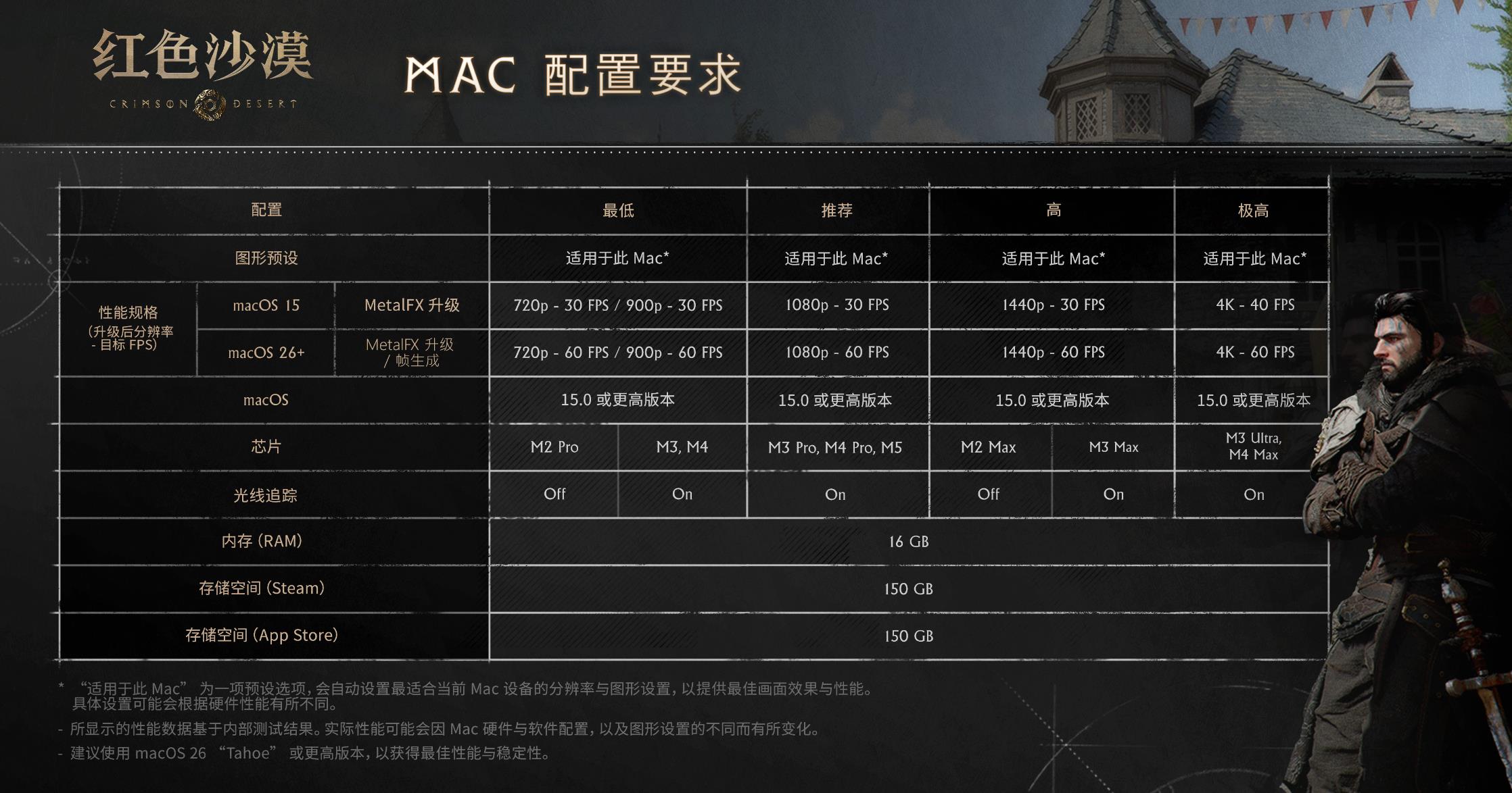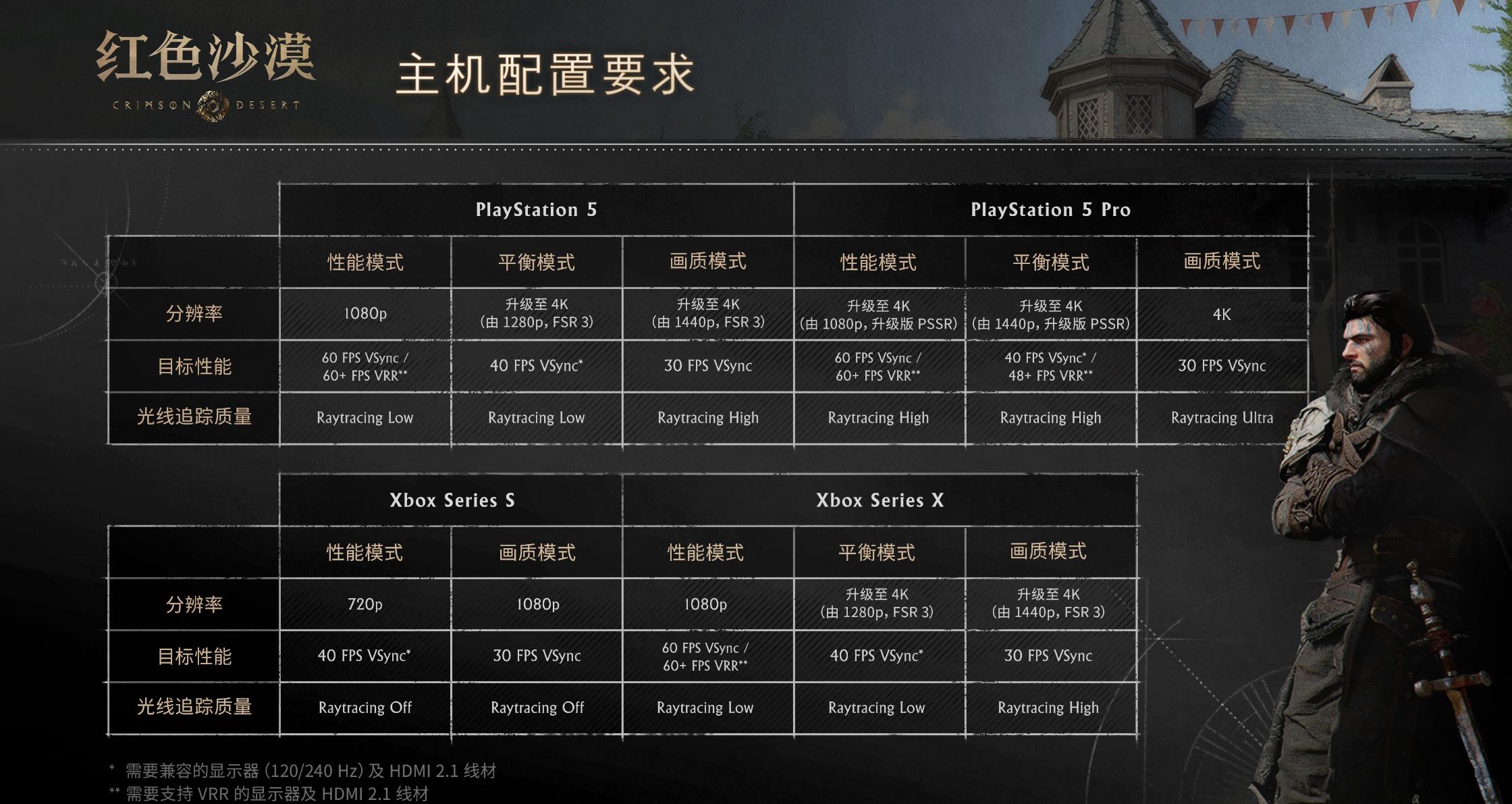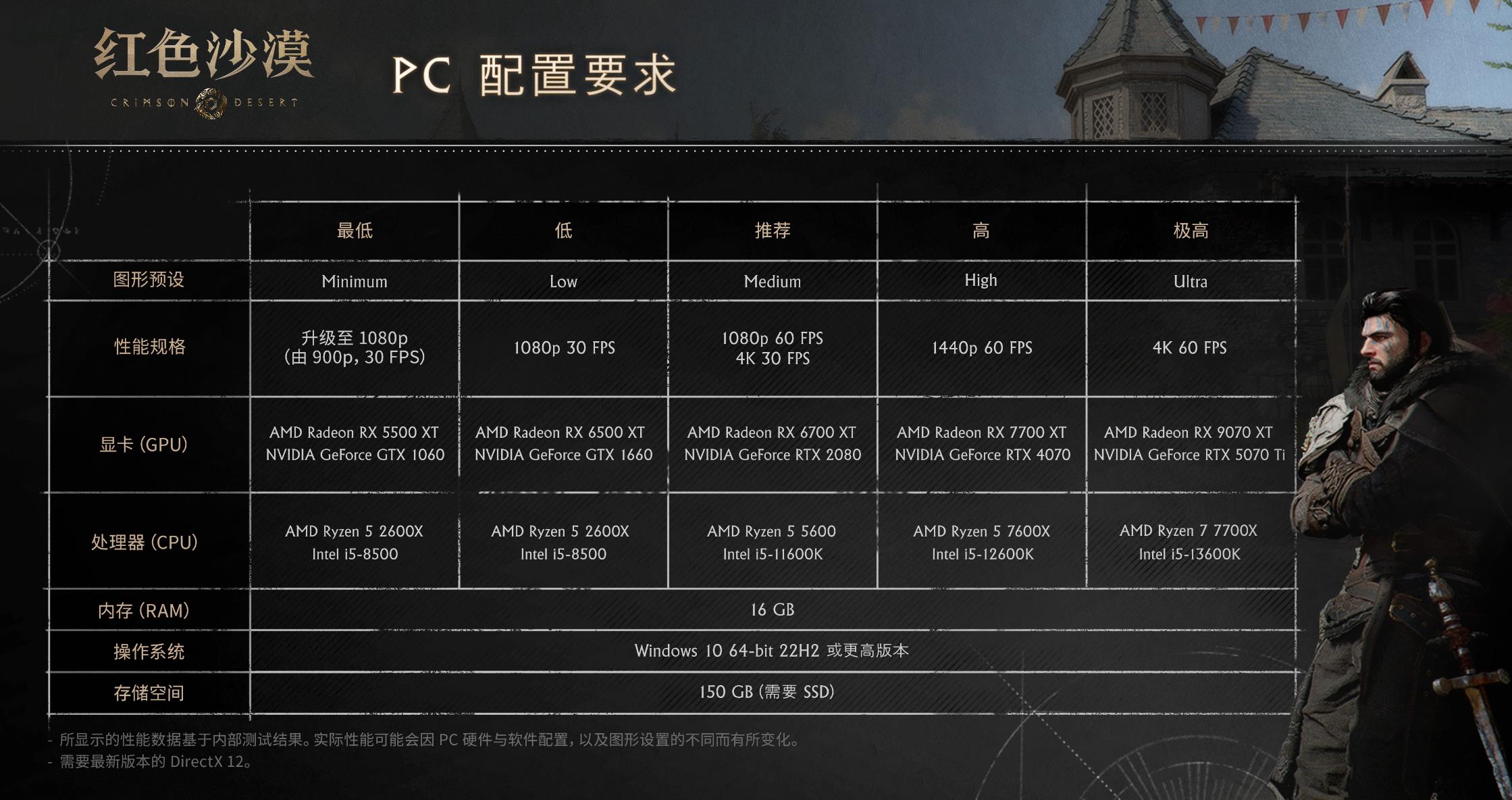 【《红色沙漠》PC配置要求及主机版性能信息揭晓】开放世界动作冒险游戏《红色沙漠》即将于3月20日发售。官方今日公布了本作各平台的性能信息。PC配置要求如下: