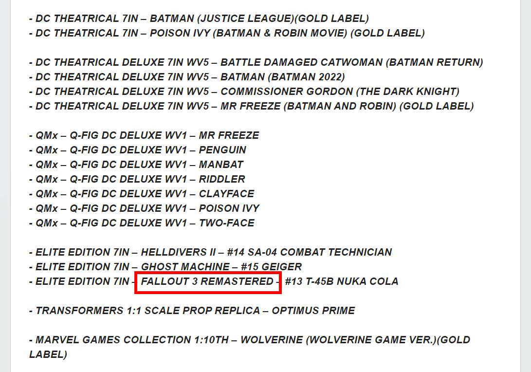 【麦克法兰玩具信息为《辐射3:Remastered》传闻再添佐证】麦克法兰在其玩具新品列表中明确标注了《辐射3:Remastered》,为该项目的传闻再添佐证。虽然官方目前还尚未正式公布,但这款经典作品Remastered版的的消息早在微软收购案庭审文件中就已开始流传。