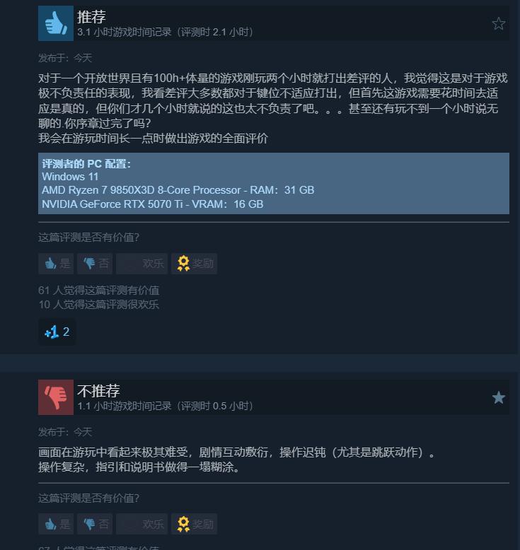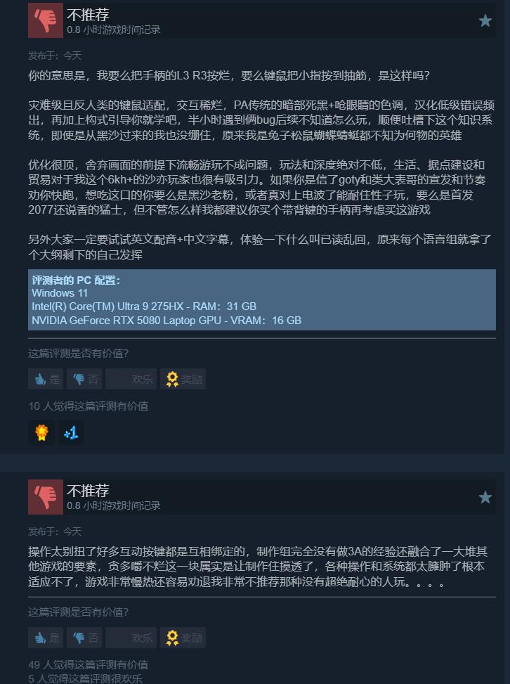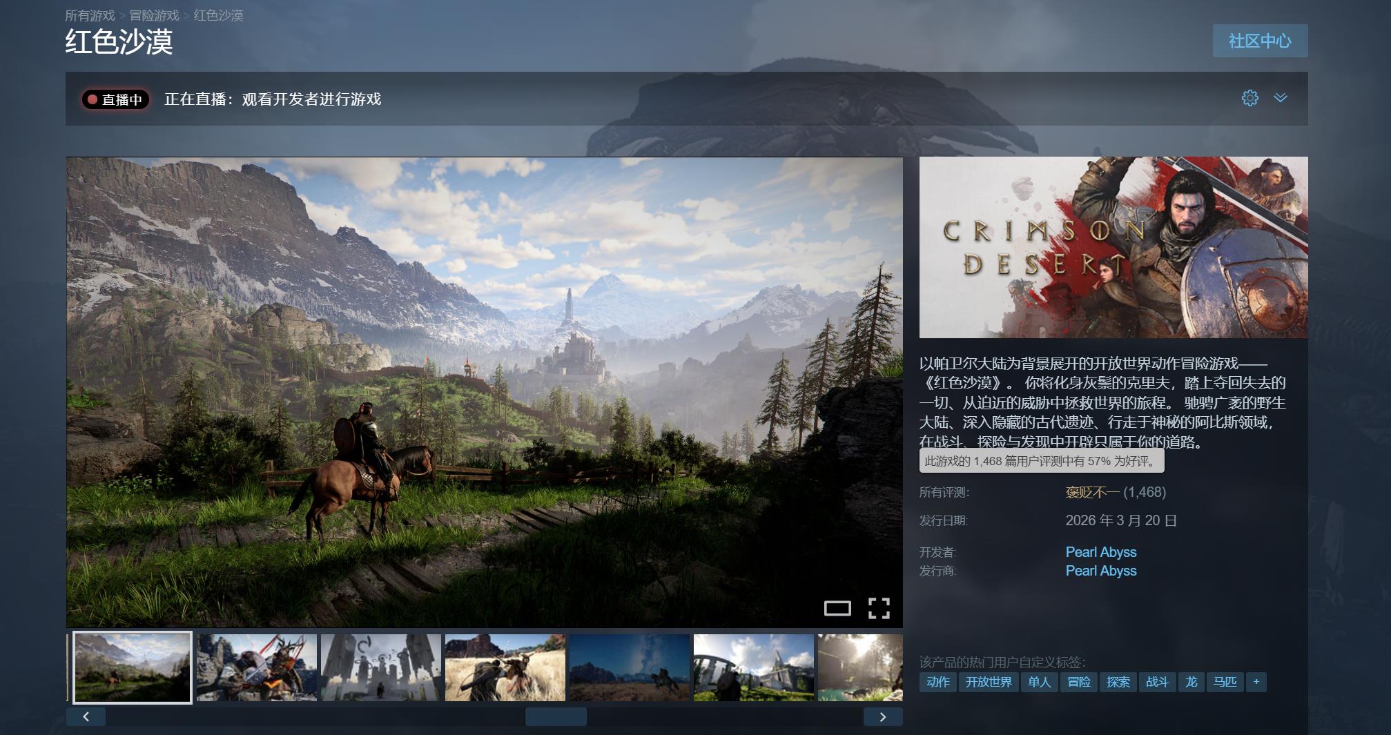 【《红色沙漠》Steam玩家评价“褒贬不一”,峰值人数达23.9万】由Pearl Abyss所带来的开放世界冒险游戏《红色沙漠》已于今早正式解锁。截至目前,本作在Steam上已有1468篇玩家评测,好评率暂为57%,整体为“褒贬不一”。国区295篇,好评率37%。从玩家的反馈来看,当前差评主要集中在按键操作体验,部分玩家也对光影表现、色调及本地化提出改进建议。