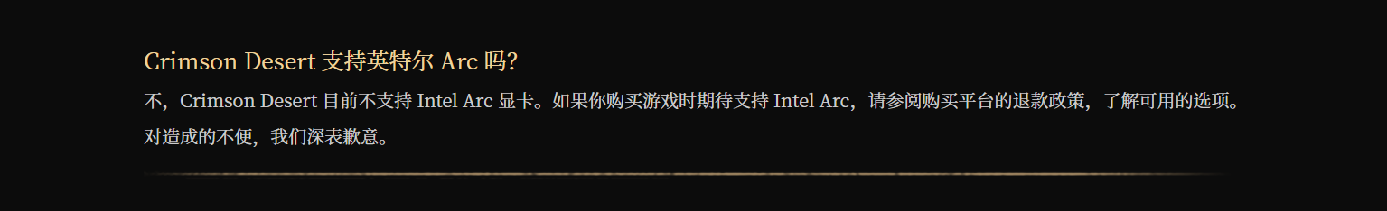 【《红色沙漠》无法在英特尔显卡上运行,官方建议受影响玩家退款】新作《红色沙漠》被曝完全无法在 Intel Arc 系列显卡上启动,玩家运行游戏时会直接弹出硬件不支持的提示。官方在 FAQ 中明确该游戏不支持 Intel Arc 显卡,并建议受影响玩家按购买平台的退款政策申请退款。