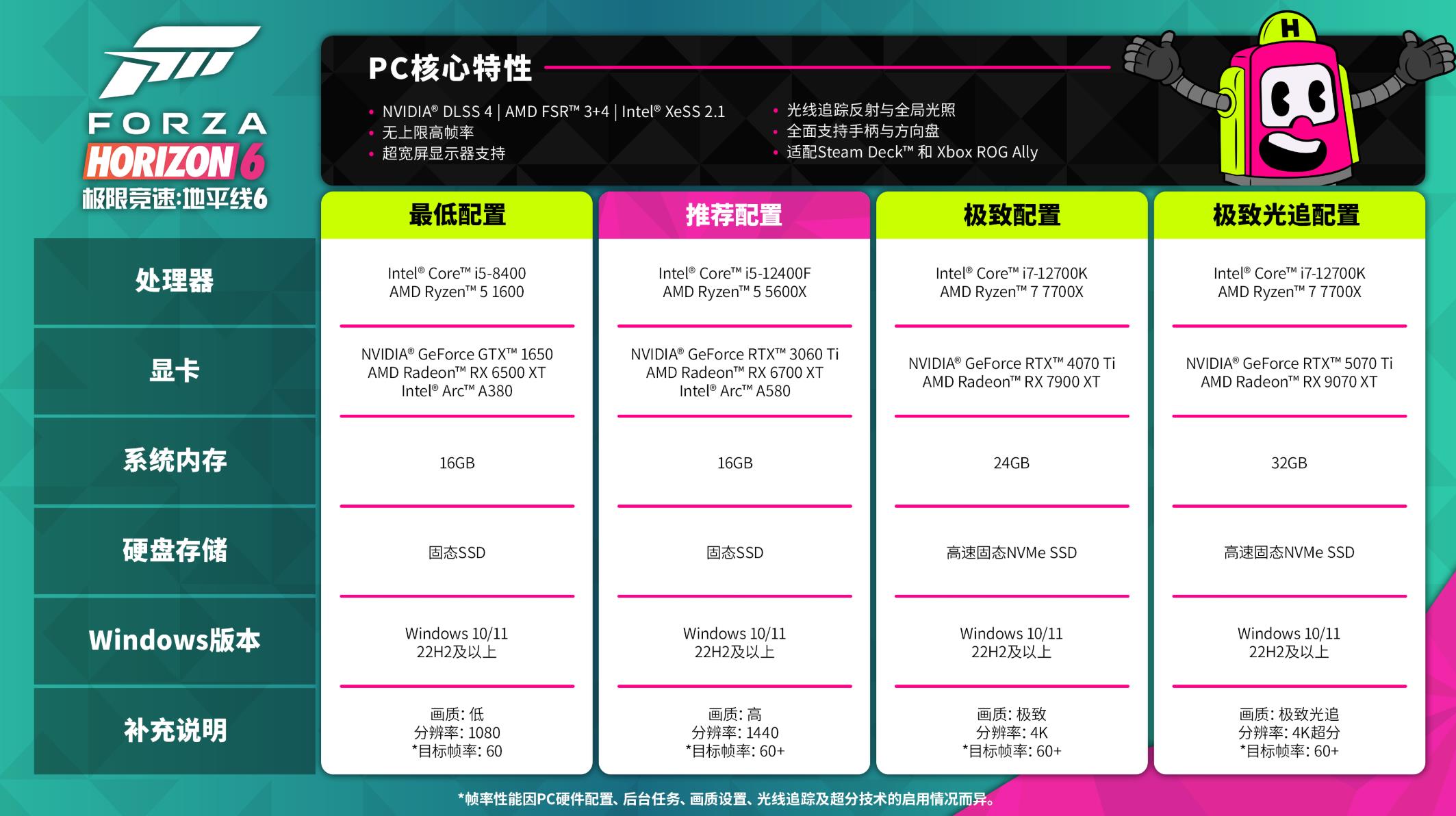 【《极限竞速:地平线6》公布PC特性及配置要求】开放世界赛车游戏《极限竞速:地平线6》即将在5月19日发售,率先登陆Xbox Series和PC平台(今年晚些时候登陆PS5)。PlayGround工作室公布了本作在PC端的配置要求及一些特性,以下为配置清单: