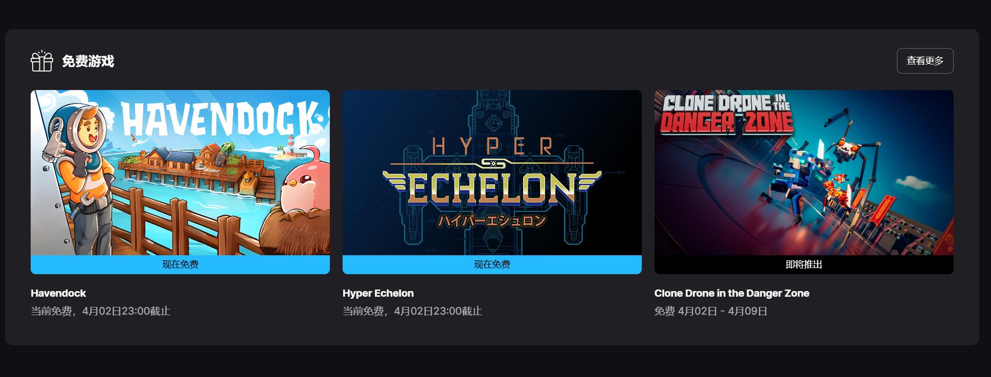 【Epic喜+2】模拟游戏《海港物语》和清版射击游戏《Hyper Echelon》现已可在Epic商店中免费领取,2026年4月2日23:00截止,领取后永久入库。下周免费游戏为《Clone Drone in the Danger Zone》。