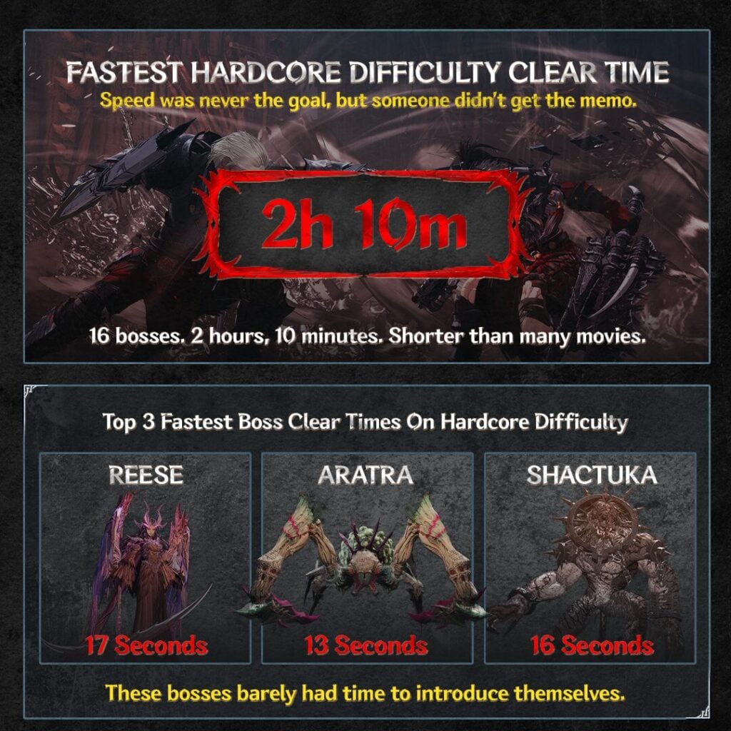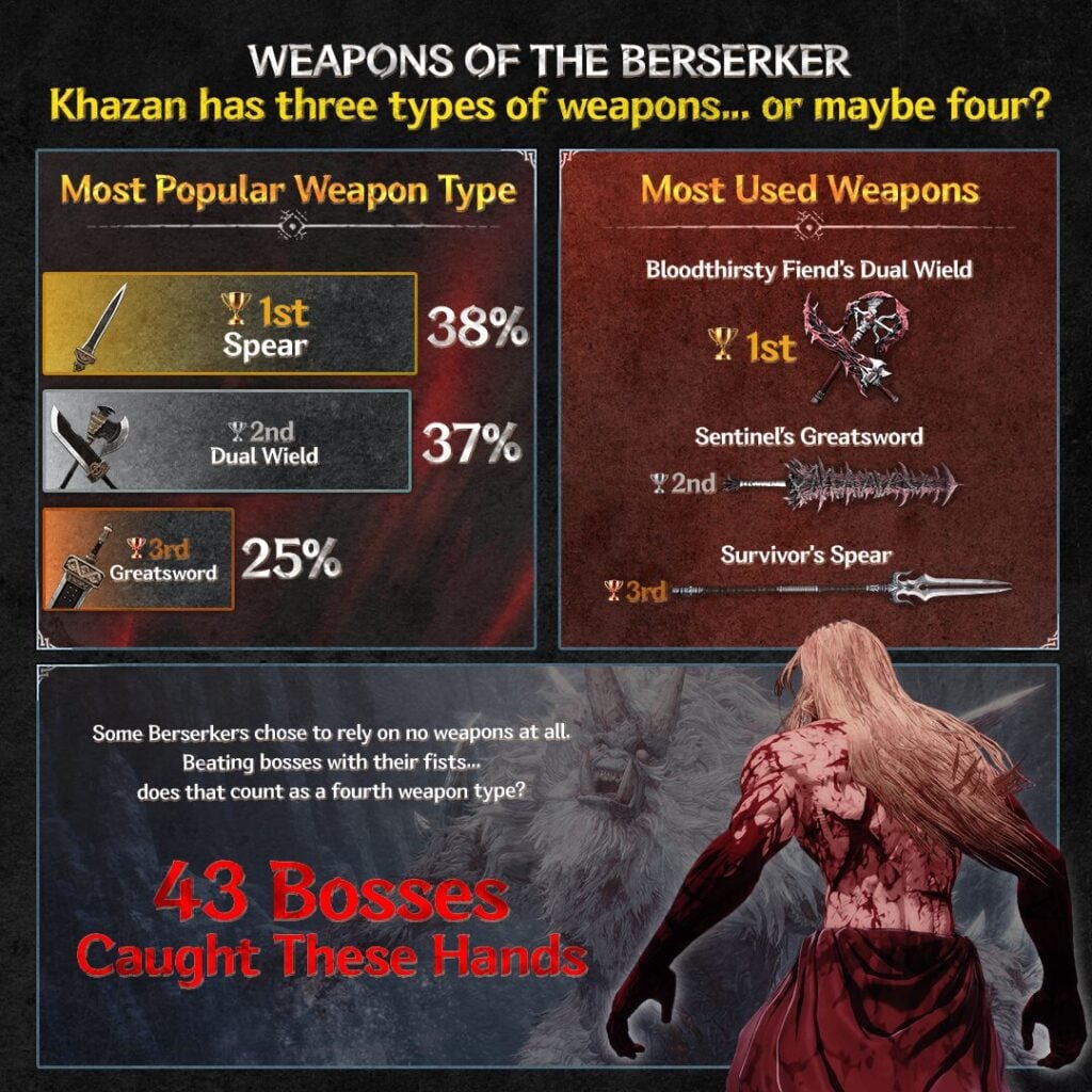武器使用方面,长枪以38%的占比成为最受欢迎武器类型,双持武器与巨剑分别占37%和25%。值得一提的是,共有43名Boss被玩家以徒手方式击败。挑战记录方面,硬核难度最快通关时间为2小时10分钟(共击败16名Boss)。
