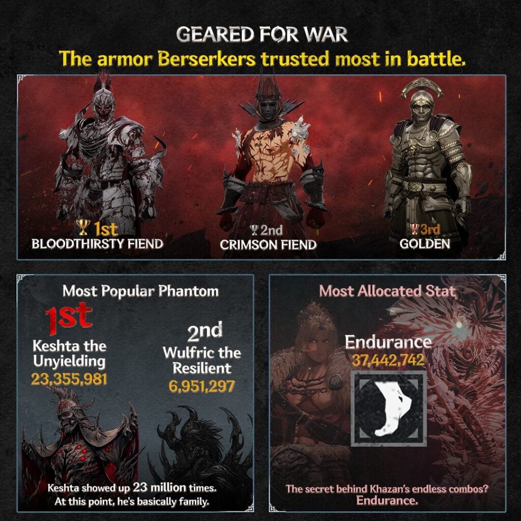 数据显示,在主线剧情完成情况中,达成“第一狂战士”结局的玩家占比最高,为40%;普通结局占35%;“锁链”结局占25%。在敌人击杀数据方面,专家难度下对玩家造成最多击杀的敌人为“毒蛇”,累计击杀超过1770万次;而在硬核难度中,“马鲁卡”位列首位,击杀次数超过20万。