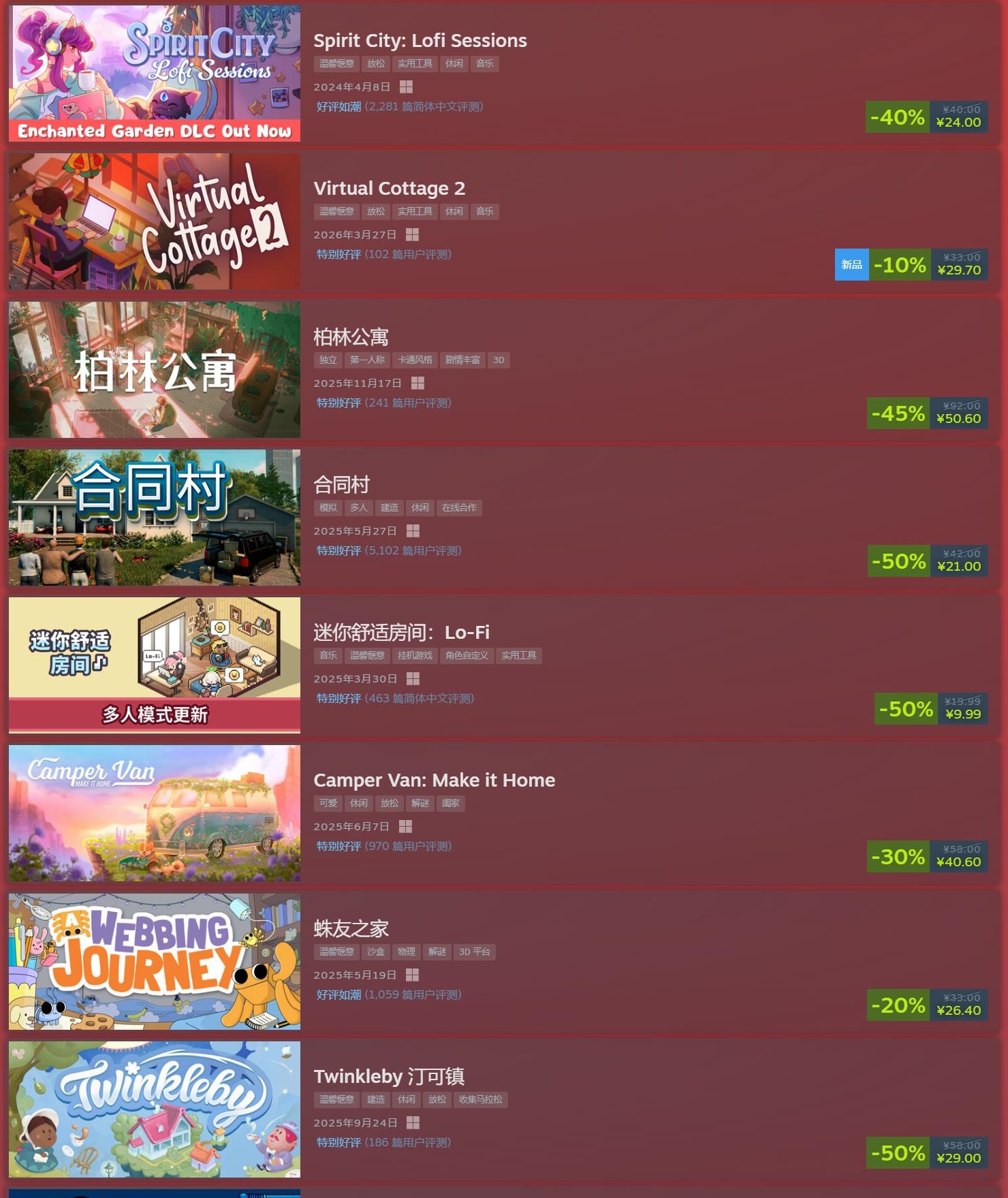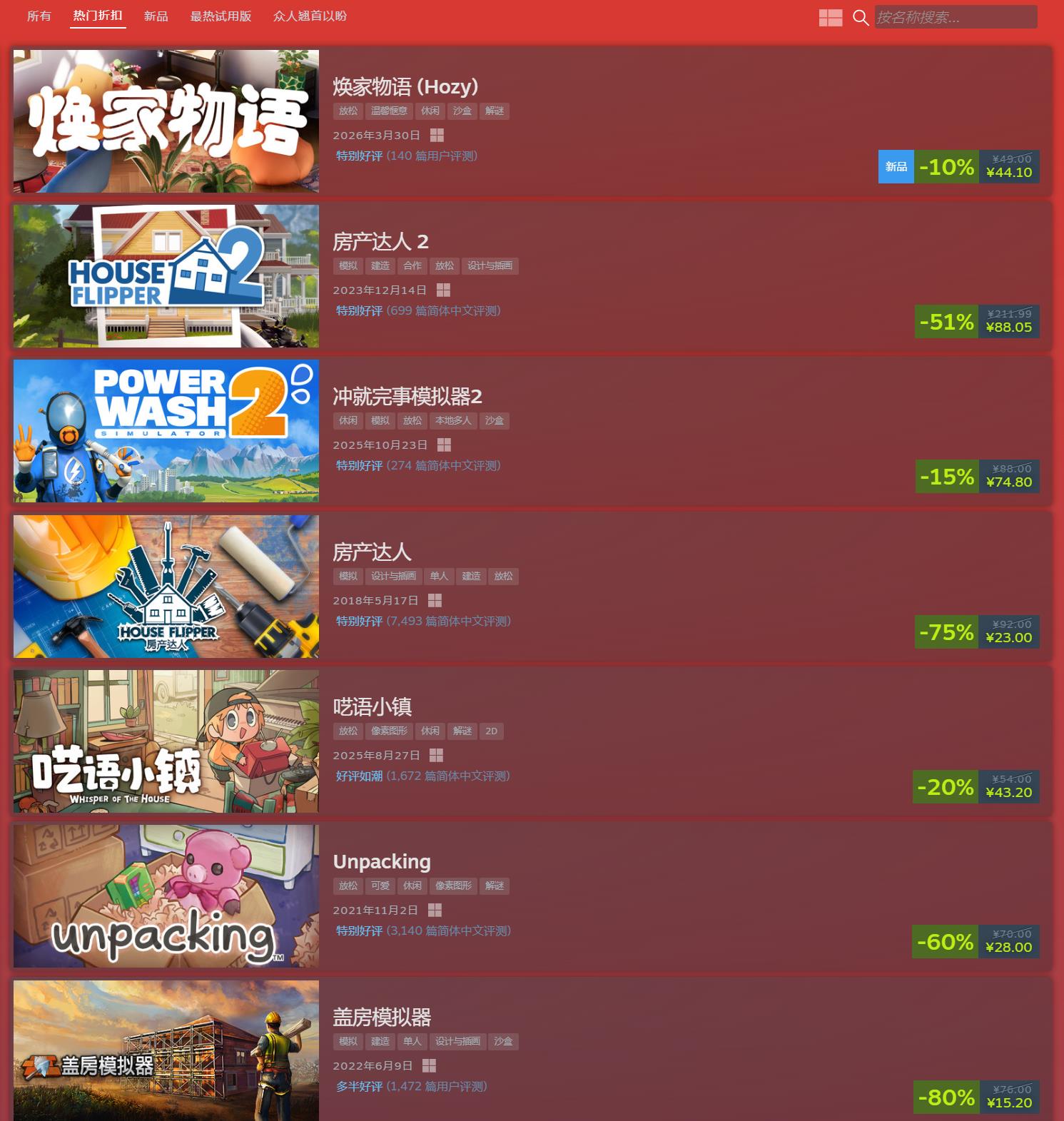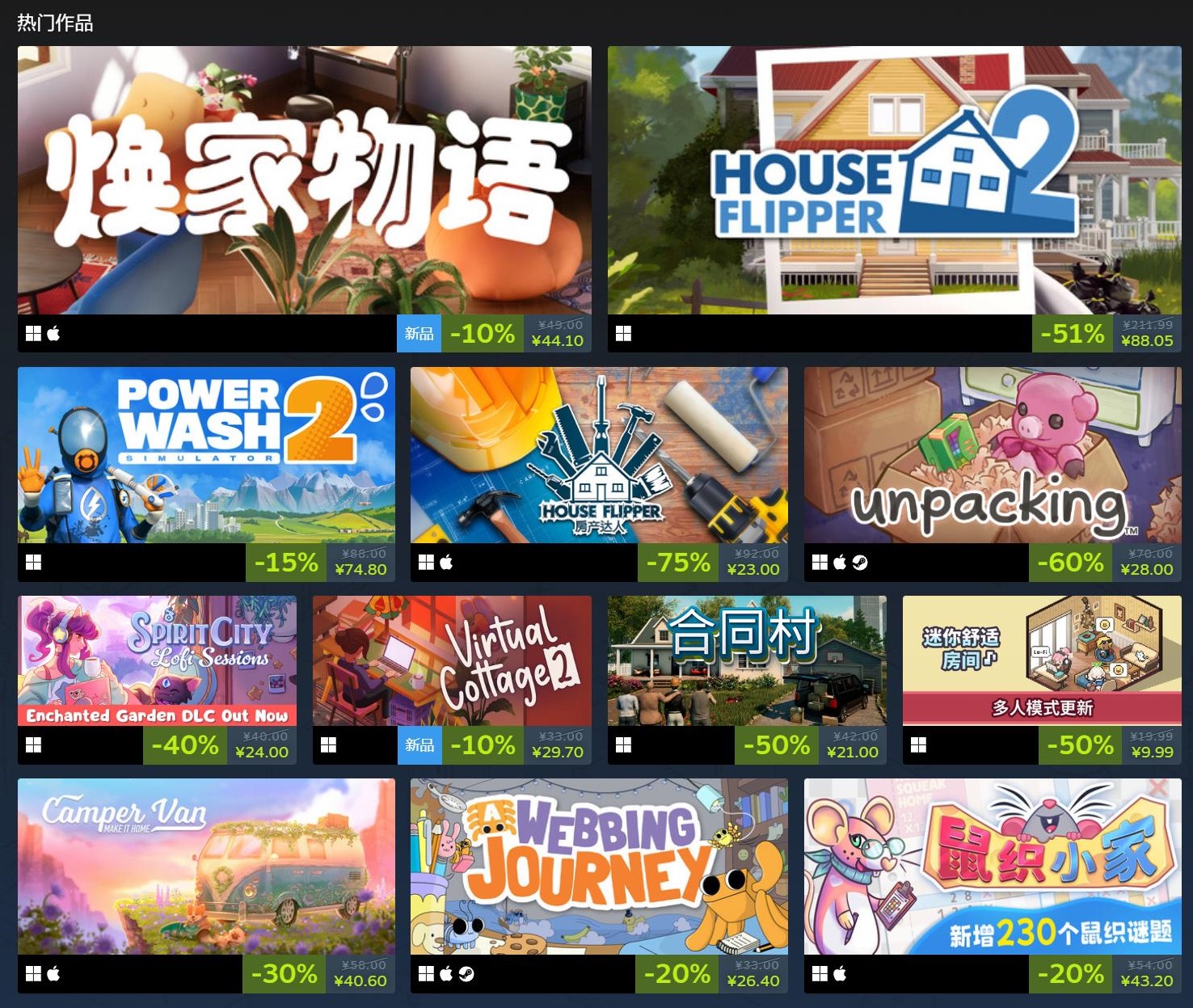 目前热门折扣游戏包括《焕家物语》《房产达人2》《冲就完事模拟器2》《Creature Kitchen》《呓语小镇》《Unpacking》《盖房模拟器》等。