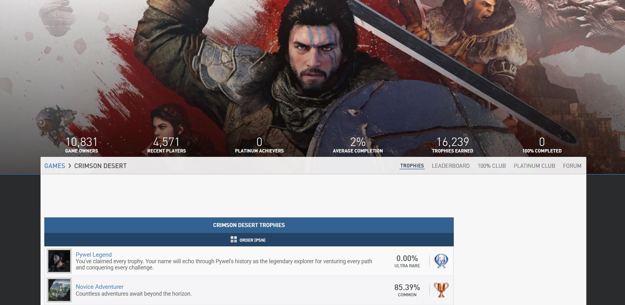 在奖杯统计网站PSN Profiles上,现阶段尚未有注册用户达成白金。目前随着开发团队持续的更新与优化,《红色沙漠》玩家评价正在逐步回暖,游戏全球累计销量也已突破300万份。