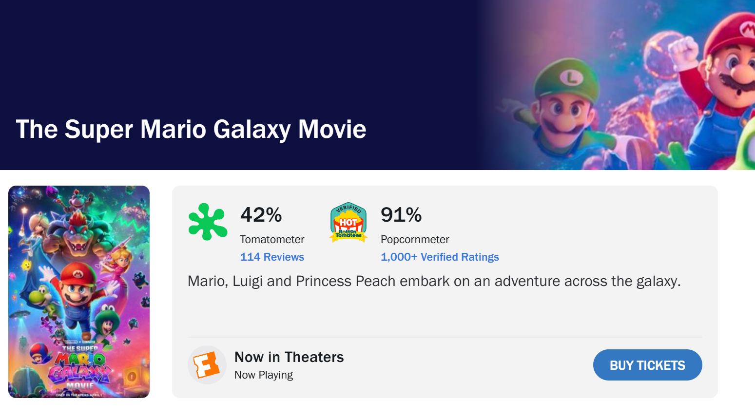 目前《超级马力欧银河大电影》在烂番茄上的爆米花指数(观众满意度)为91%,远高于由专业影评人给出的新鲜度42%。和《超级马力欧兄弟大电影》一样*,两者之间存在较大的差异。这款由任天堂和照明娱乐所打造的动画电影即将于4月3日(明日)在内地大银幕上与玩家们正式见面。