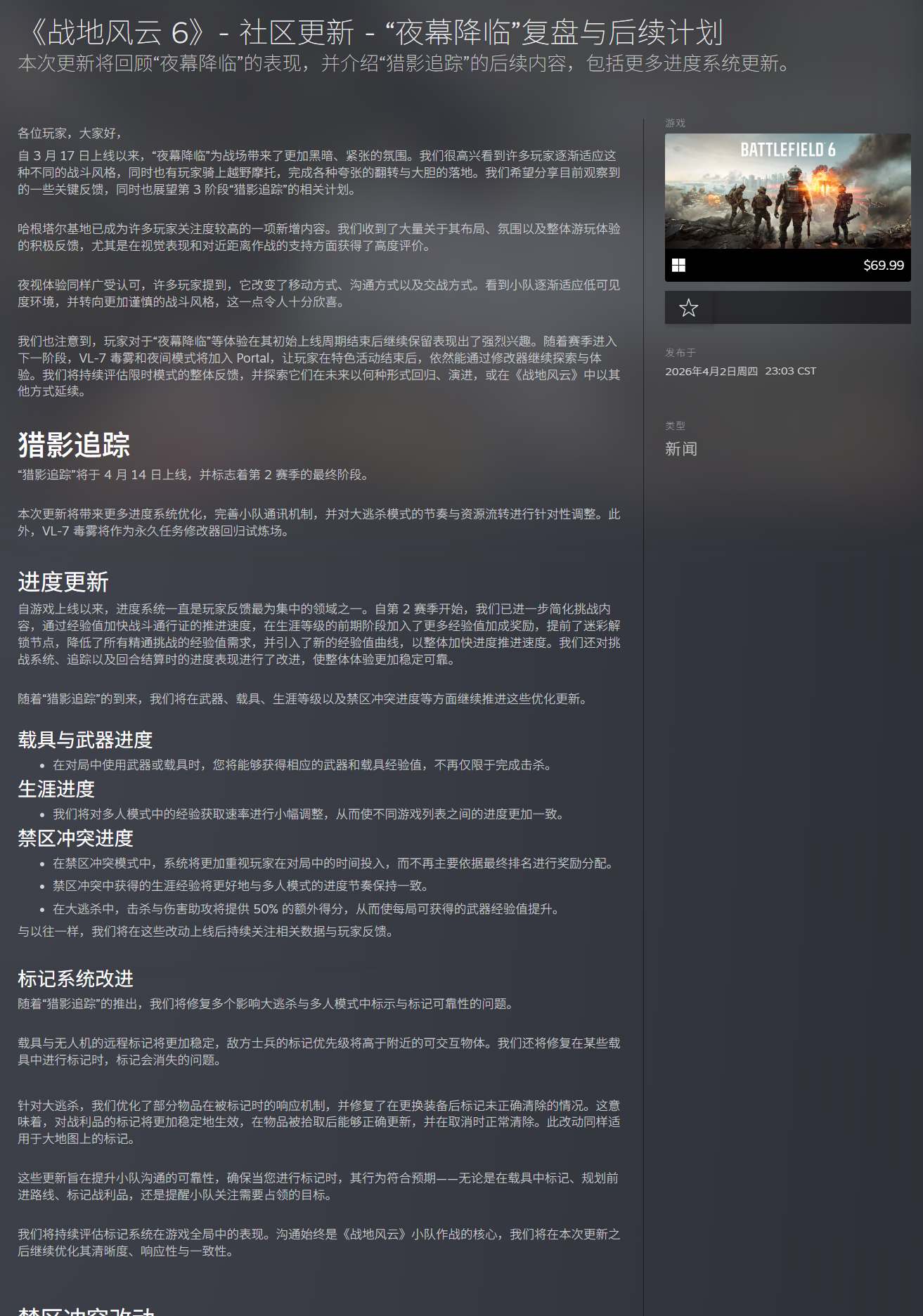 《战地6》“猎影追踪”4月14日上线,赛季收官迎多项优化