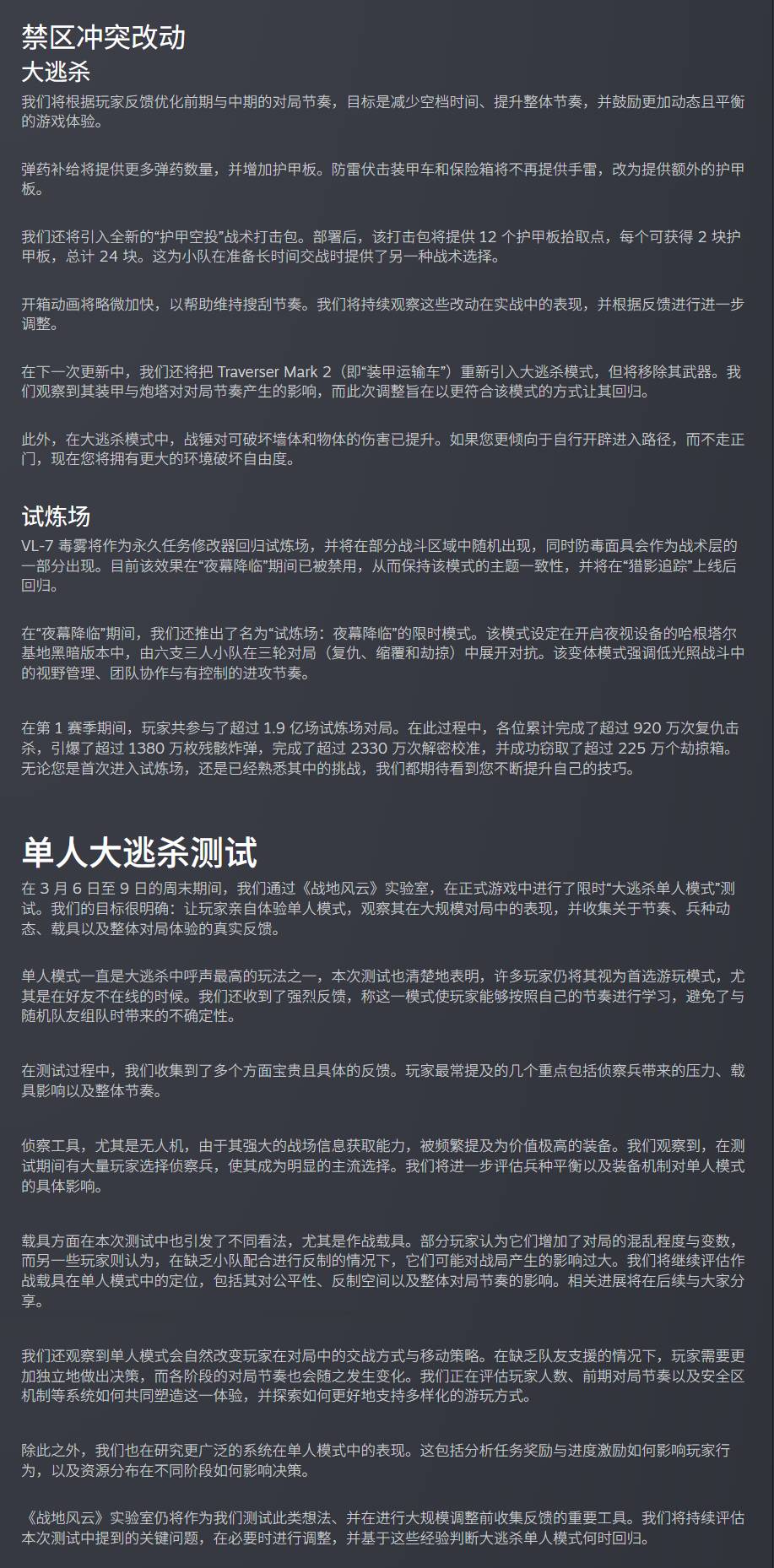 本次更新将保留 “夜幕降临” 活动广受好评的 VL-7 毒气与夜间模式,官方计划后续为其推出限时轮换选项;全面优化进度系统,覆盖载具、武器、玩家生涯等模块,加快玩家成长节奏。同时将 VL-7 设为 Gauntlet 模式常驻内容,上线大量平衡性与体验优化内容,官方承诺将持续为游戏推出更新。