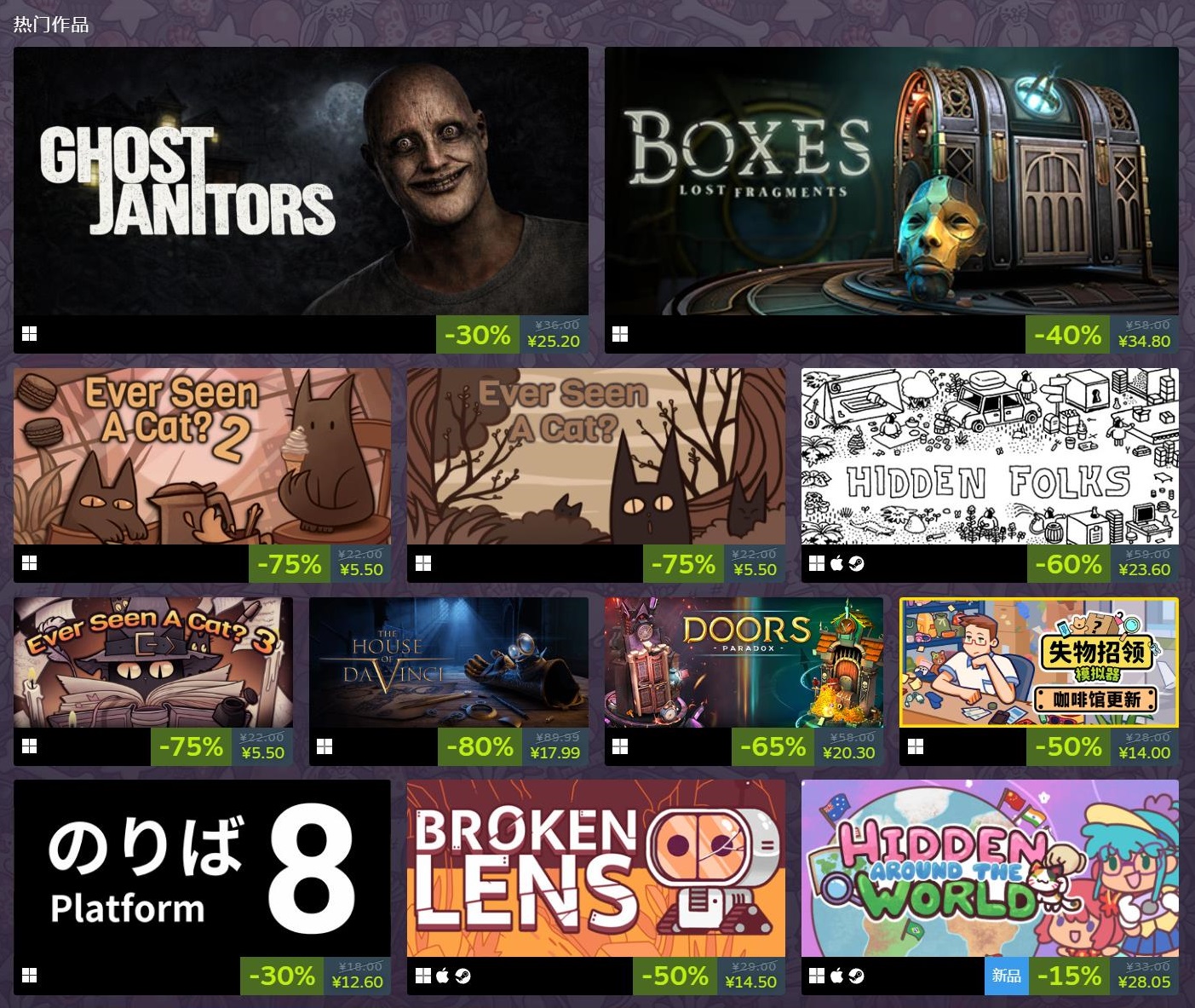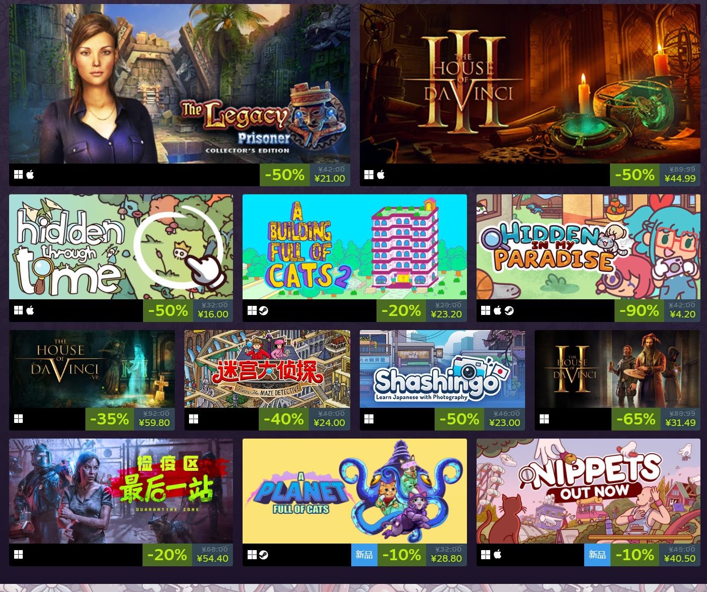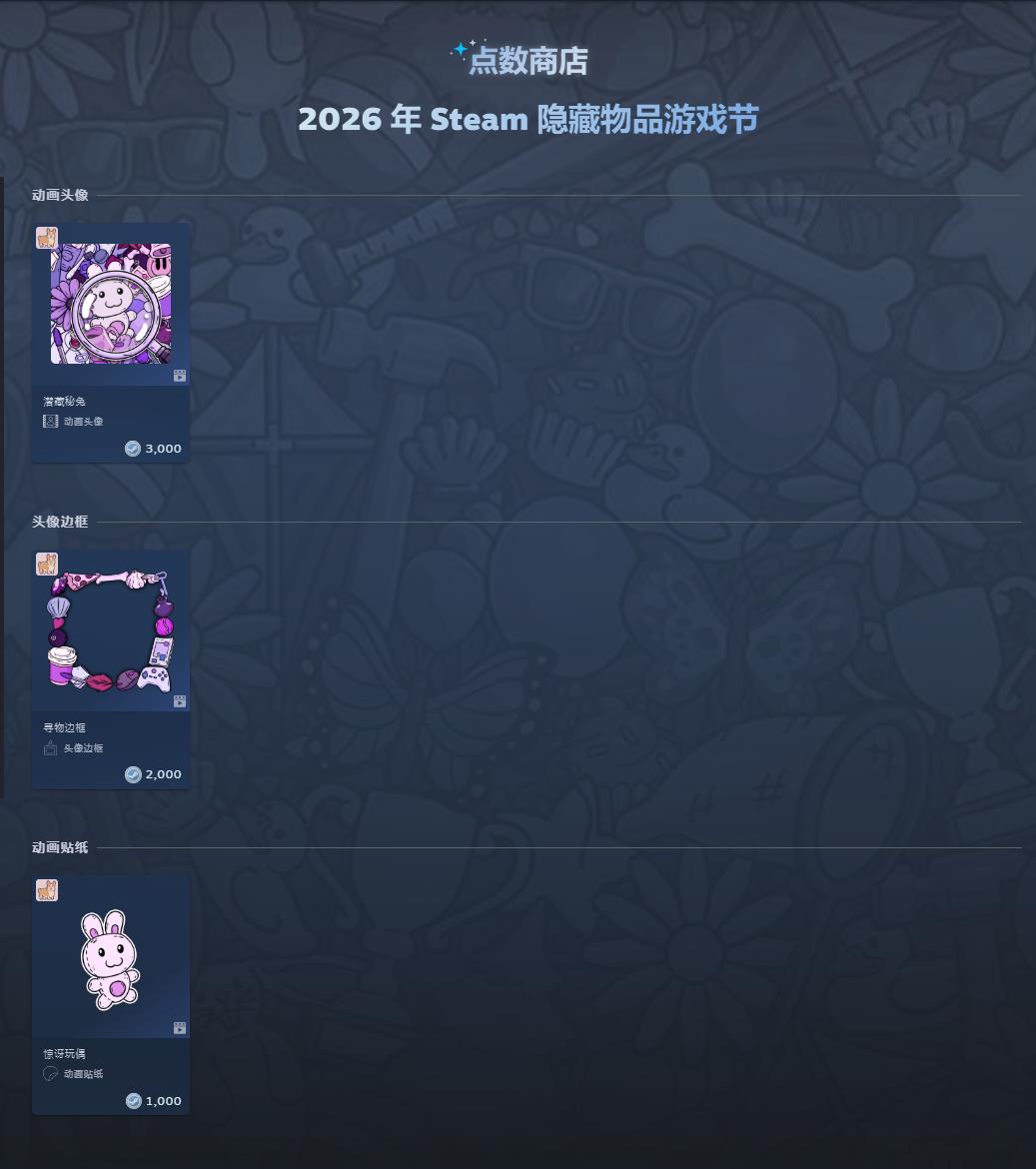 【Steam今日开启“隐藏物品游戏节”,多款作品限时优惠中】Steam“隐藏物品游戏节”今日正式开启,活动持续到4月14日凌晨1点。期间众多互动解谜游戏正在限时优惠中,人气折扣游戏包括《检疫区:最后一站》《A Planet Full of Cats》《失物招领模拟器》《Hidden Folks》《Boxes: Lost Fragments》等。此外,点数商店还推出了隐藏物品游戏节的动画头像“潜藏秘兔”、头像边框“寻物边框”、 动画贴纸“惊讶玩偶”,玩家可分别以3000、2000、1000点数进行兑换。