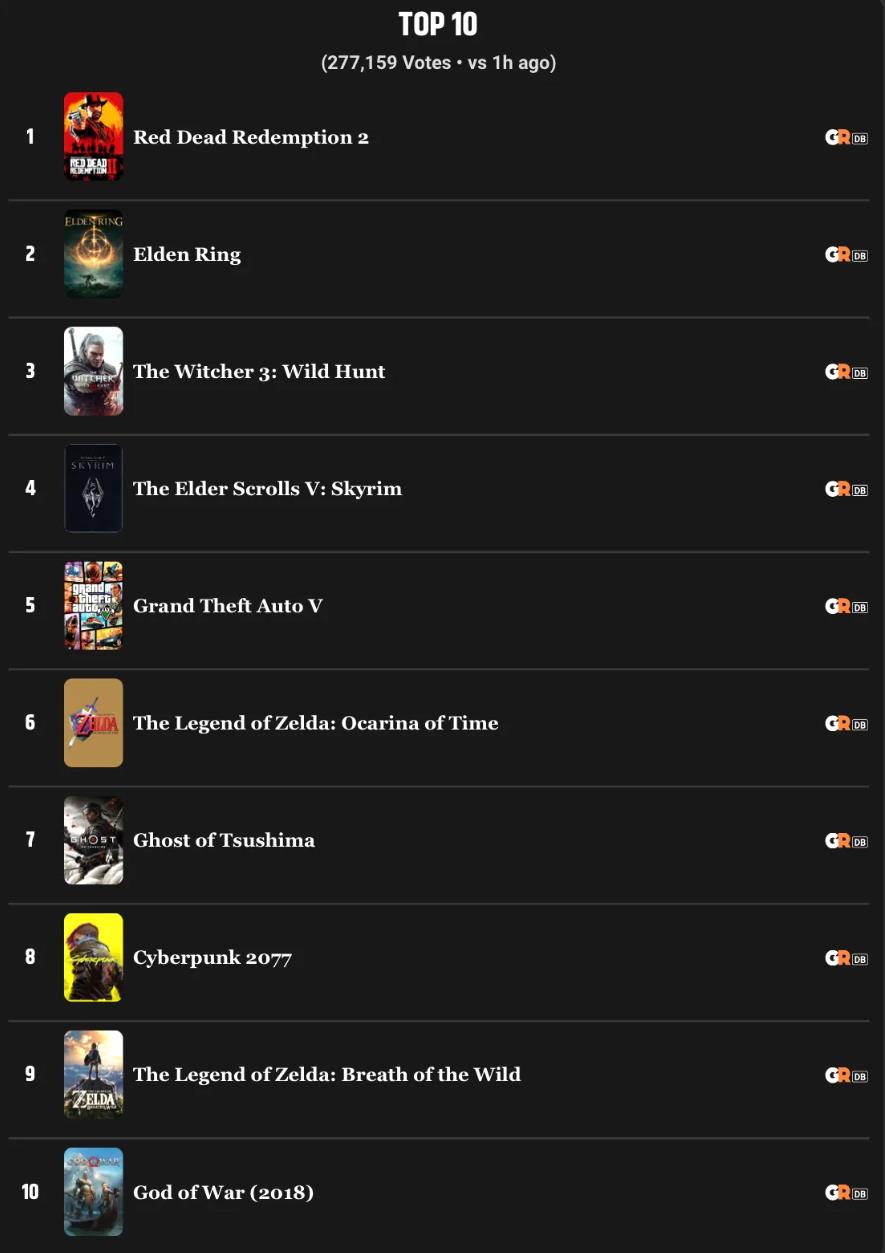 【《荒野大镖客2》登顶!海外玩家票选史上最佳游戏TOP 10】海外游戏媒体GameRant本月初基于读者投票整理,在近8万份投票结果中,评选出了玩家心中的“史上最佳10款游戏”。其中《荒野大镖客2》获得首位,《战神》双作入榜,不知大家最喜欢的作品是哪一款呢? 1、《荒野大镖客2》 2、《上古卷轴5:天际》 3、《艾尔登法环》 4、《巫师3:狂猎》 5、《蝙蝠侠:阿卡姆之城》 6、《生化危机4》 7、《战神(2018)》 8、《合金装备》 9、《赛博朋克2077》 10、《战神:诸神黄昏》
