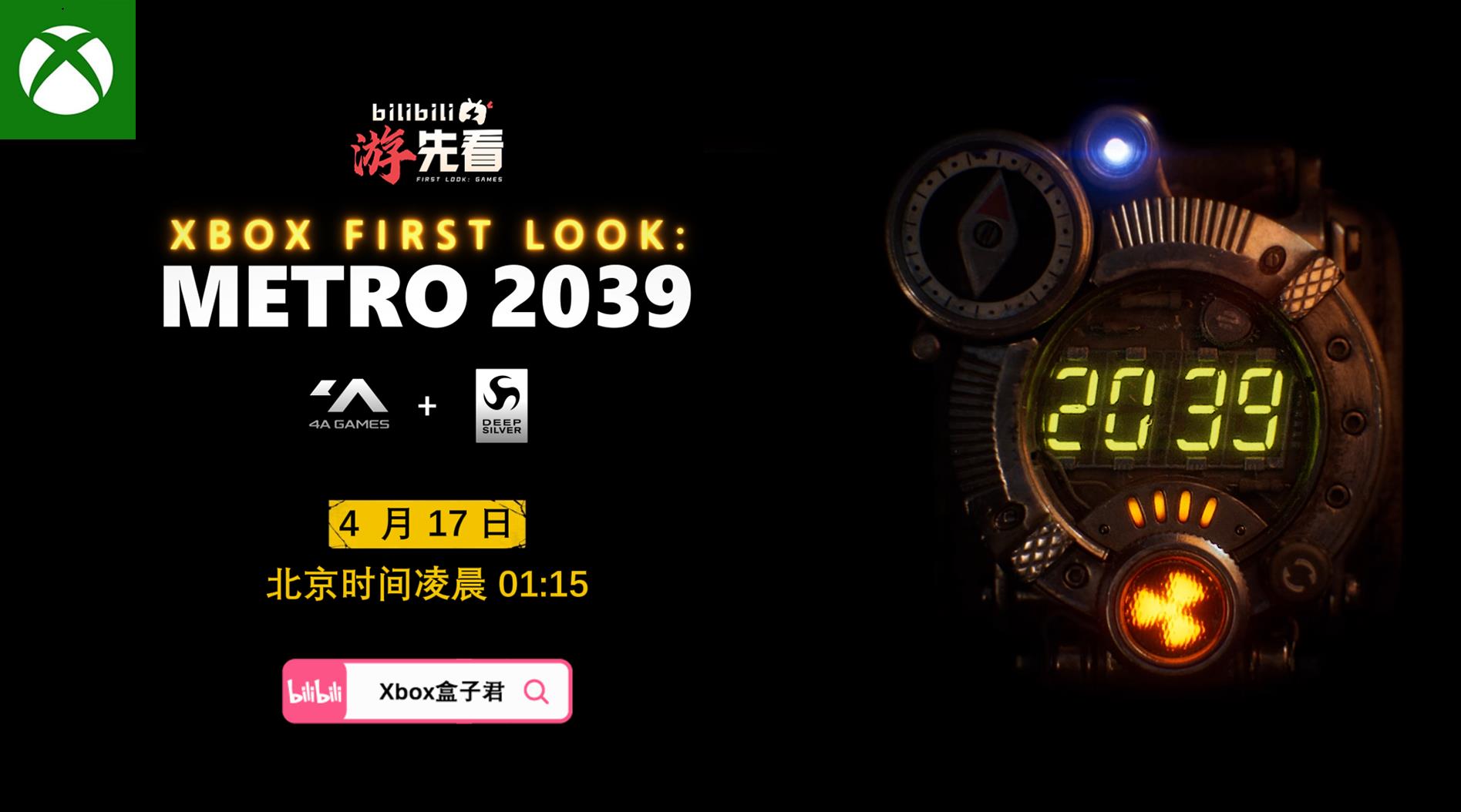 【《地铁:2039》今日正式公开,更多消息4月17日Xbox专场发布会公布】《地铁(Metro)》系列今日正式发布预热公告,宣布其新作名称为《地铁 2039》。本作是继《地铁2033》《地铁:最后的曙光》《地铁:离乡》后的系列第四部正统作品。Xbox将于北京时间4月17日凌晨1点15分为其举行专场直播,届时会带来这款游戏的首发预告。本次新作正式揭晓的内容也将参加 “游先看”活动,于北京时间 4月17日凌晨1点15分在国内B站独家首发。