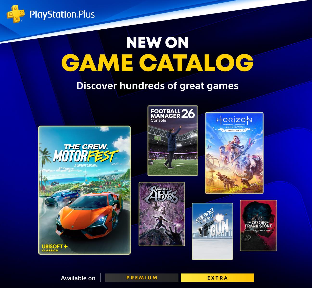 【《地平线:零之曙光》重制版等作即将入库!4月PS+2/3档新增游戏公布】SIE今日公布了2026年4月PS+欧美地区2/3档会员库新增游戏。所有作品将于4月21日入库,具体如下: 2档新增游戏 PS4/PS5《地平线:零之曙光》重制版 PS4/PS5 《飙酷车神:轰鸣盛典》 PS5 《足球经理26》主机版 PS4/PS5《无双:深渊》 PS5 《松鼠遇到枪》 PS5 《The Casting of Frank Stone》 PS5 《怪物火车》 3档新增游戏 PS4/PS5《荒野兵器4》