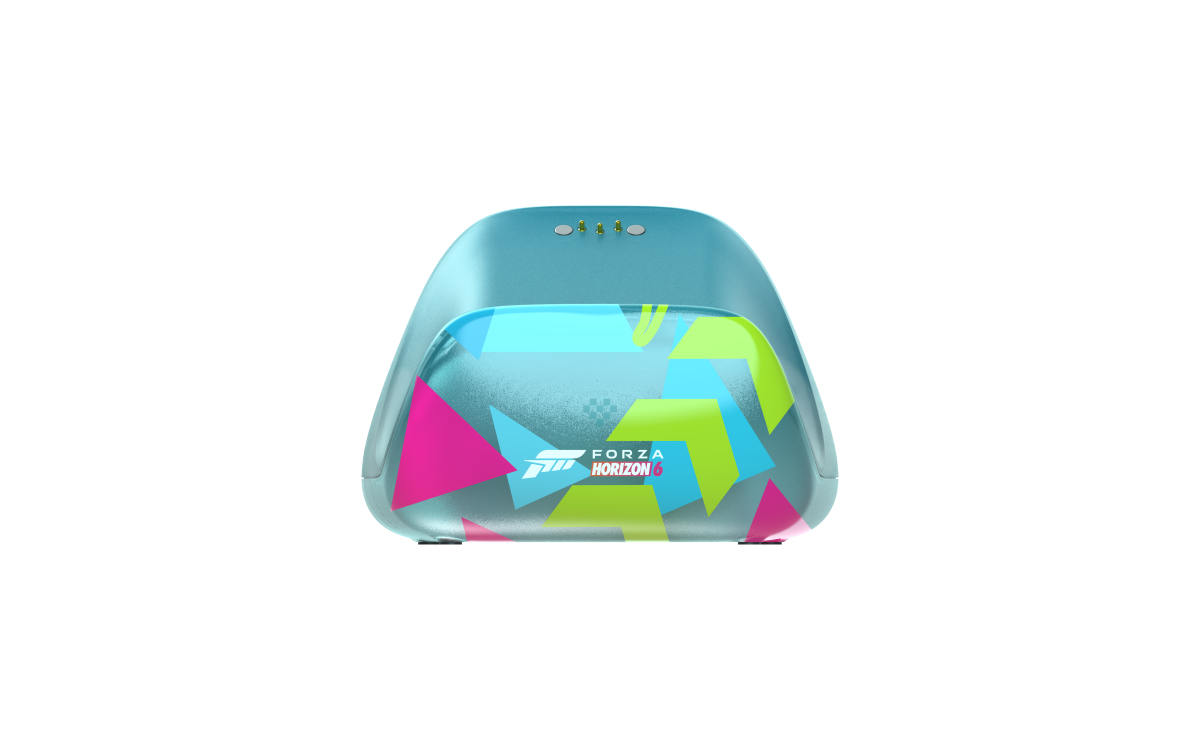 两款产品均大胆采用了明媚的鲜艳配色。其中限定款手柄是Xbox发布过的最鲜艳的手柄之一。透明青蓝色的顶壳逐渐过渡到金属渐变,搭配伏特绿、热粉色和银色。银色金属DPad和双色橡胶钻石握把进一步强调了色彩点缀。其核心设计灵感源自峠道。峠指的是穿越山坡的蜿蜒狭窄道路,也被誉为漂移的发源地,手柄正面描绘的峠道俯瞰图,完美地向街头赛车做了致敬。此外,第三方配件商八位堂还会推出独立贩卖的手柄充电底座(图6),采取和限定手柄相同风格的设计,以供玩家选购。