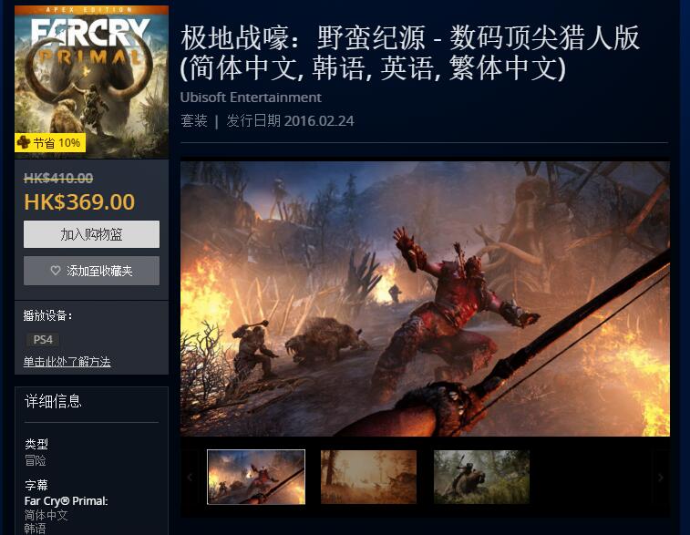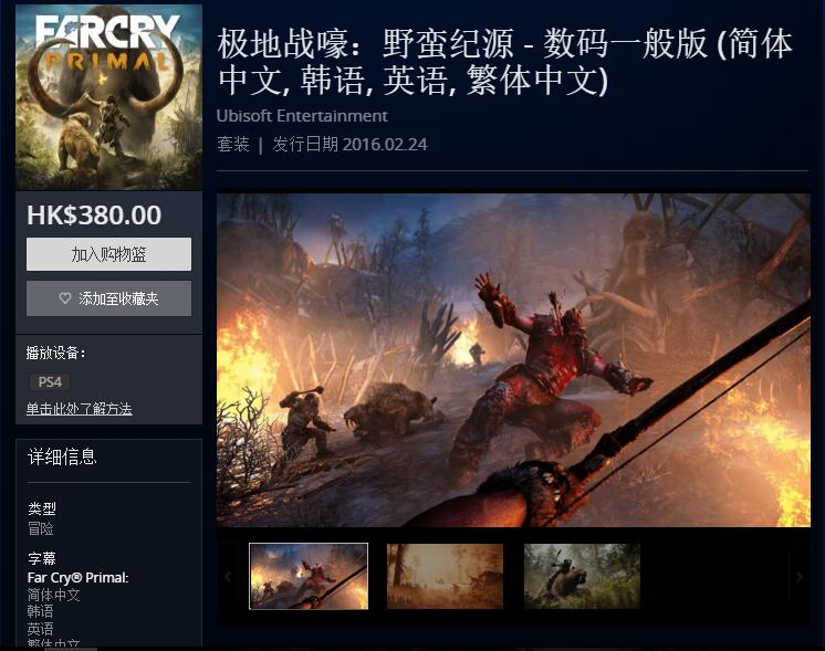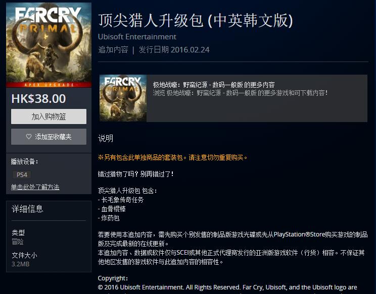 虽然迟了一天,并且没有任何说明以及解释,《孤岛惊魂:野蛮纪源》今日终于登陆了港服PSN商城。游戏分为一般版与顶尖猎人版,其中顶尖猎人版为"一般版(380港币)+顶尖猎人包(38港币)"的同捆,并且PS+会员可以享受额外折扣,售价410港币(PS+会员369港币,甚至比普通版还便宜)。一般版的游戏特典包括猫头鹰包、长毛象包、以及剑齿虎包,而顶尖猎人包包含了长毛象传奇任务、武器血骨棍棒、以及炸药包。