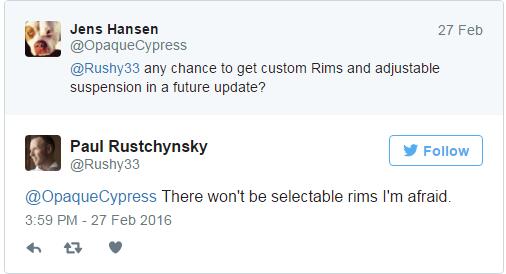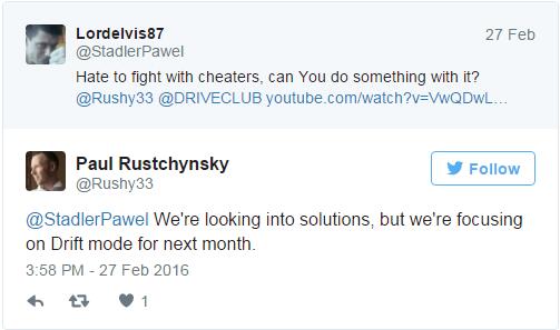 《驾驶俱乐部》发售至今已有一年多,但是良心开发商Evolution Studios似乎并没有停止为游戏添砖加瓦的想法。近日,《驾驶俱乐部》游戏总监Paul Rustchynsky在推特上与玩家互动是透露了一些关于游戏日后发展方向的思路。首先,Rustchynsky很遗憾地表示他们不会加入自定义轮毂的设置。其次,对于玩家所关心的排行榜作弊行为,官方正在积极地与这一现象作斗争。而在游戏的3月更新中将对原有的甩尾模式进行一定程度的改进,这也正是Evolution近期工作的重点项目。最后,对于游戏近几日出现的服务器问题,Rustchinski表示将会在24小时内获得修复,请玩家们放心。