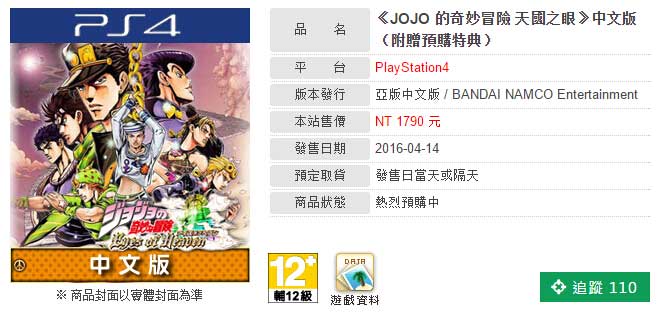 台湾巴哈商城今日显示PS4/PS3平台游戏《JOJO 的奇妙冒险:天堂之眼》中文版将于4月14日发售,初回特典为可操纵角色 “第四部 空条承太郎” 下载码一组、5个高难度任务下载码一组(完成后可取得10套稀有服装)、“第四部 仗助&康一&亿泰” 胜利台词及姿势下载码一组、“第六部 白蛇” 胜利台词下载码一组。