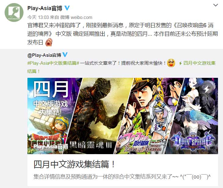 #悲报#游戏零售商Play-Asia透露原定于明日发售的《召唤之夜6:消逝的境界》中文版将延期推出,具体发售日目前尚未公布,看来期待本作的玩家们则需要再等上一段时日了。更新:港服BLOG已经将游戏发售日正式更改为待定