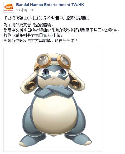 万代南梦宫官方脸书今日宣布,为了提供更完善的游戏体验,中文版《召唤之夜6:消逝的境界》将调整至4月20日发售,数字下载版将于当日15:00上架。