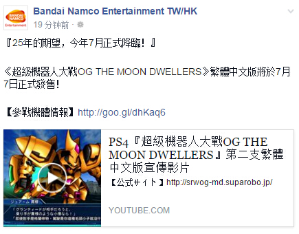 Bandai Namco脸书今日公布PS4《超级机器人大战OG:月之住民》繁体中文版将于2016年7月7日正式发售,最新中文版宣传片正在上传中!请各位稍作等待~
